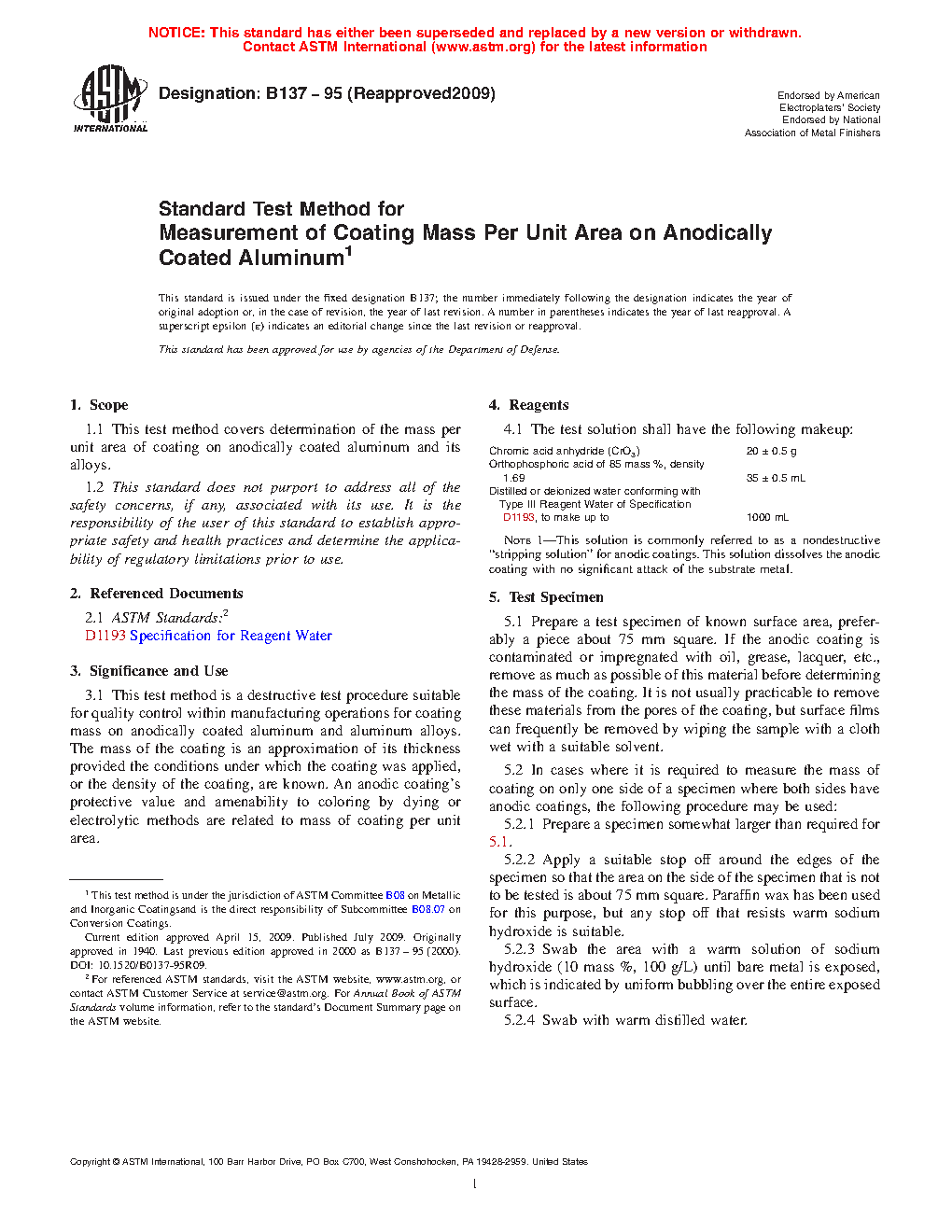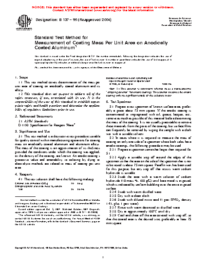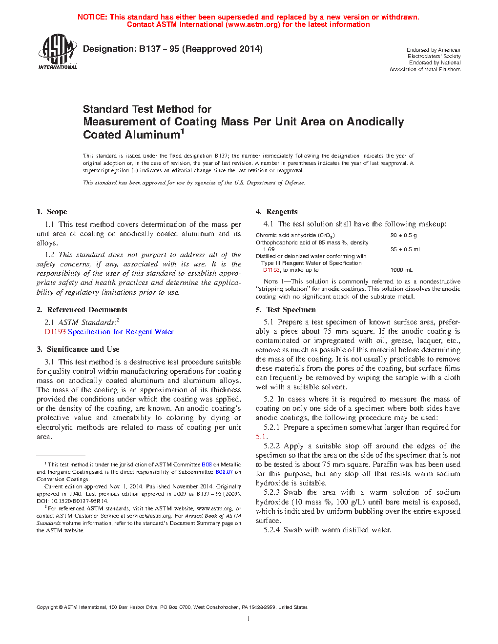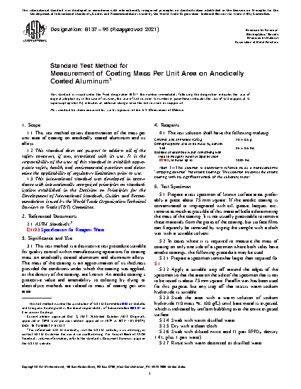 This test method is a destructive test procedure suitable for quality control within manufacturing operations for coating mass on anodically coated aluminum and aluminum alloys. The mass of the coating is an approximation of its thickness provided the conditions under which the coating was applied, or the density of the coating, are known. An anodic coating’ protective value and amenability to coloring by dying or electrolytic methods are related to mass of coating per unit area.