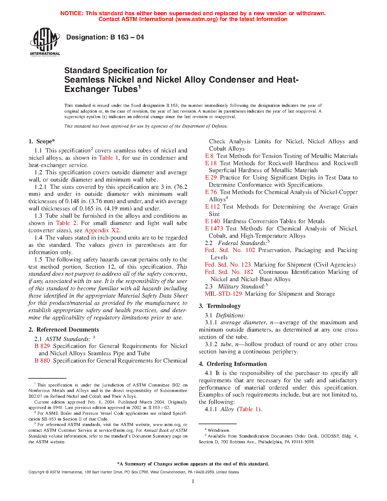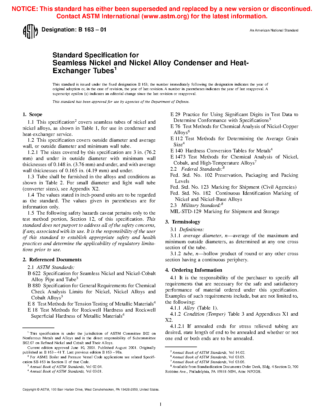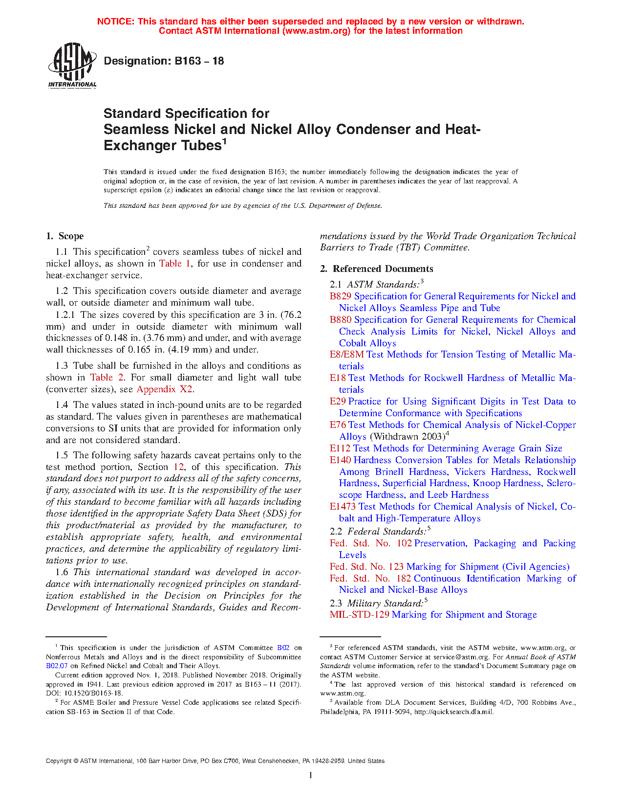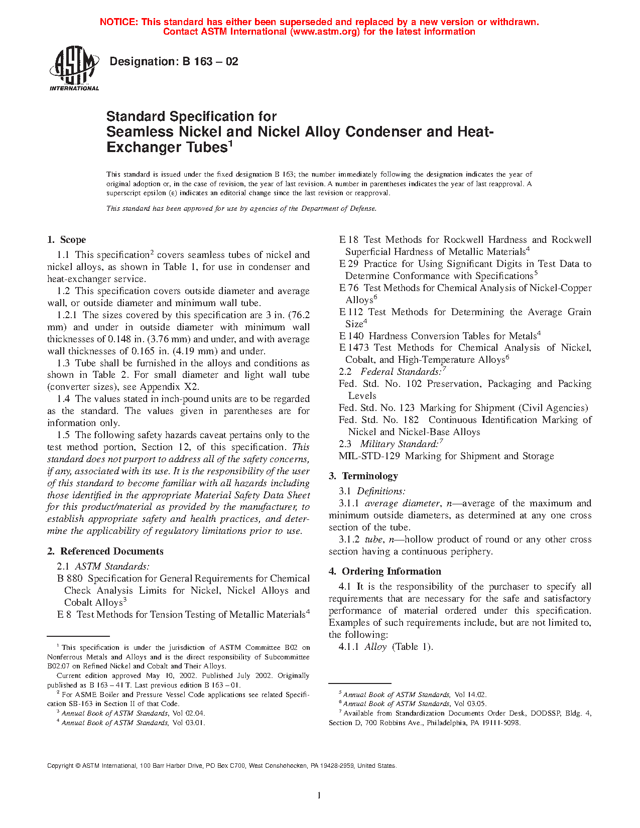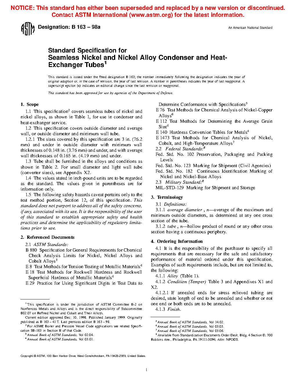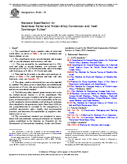 1.5 The following safety hazards caveat pertains only to the test method portion, Section 12, of this specification. This standard does not purport to address all of the safety concerns, if any, associated with its use. It is the responsibility of the user of this standard to become familiar with all hazards including those identified in the appropriate Material Safety Data Sheet (MSDS) for this product/material as provided by the manufacturer, to establish appropriate safety and health practices, and determine the applicability of regulatory limitations prior to use. This specification covers seamless tubes of nickel and nickel alloy for use in condenser and heat-exchanger service. This covers outside diameter and average wall, or outside diameter and minimum wall tube. Tube shall be furnished in the alloys and conditions defined by this specification. The material shall conform to the composition limits of nickel, copper, molybdenum, iron, manganese, carbon, silicon, chromium, aluminium, titanium, phosphorus, cerium, zirconium, yttrium, born, cobalt, columblum, tungsten, and nitrogen specified. Tensile strength, yield strength, elongation, and Rockwell hardness of the material shall conform to the required mechanical properties set by this specification. Test methods such as chemical analysis, tension, rounding procedure, Rockwell hardness, grain size and hardness conversion shall be performed.