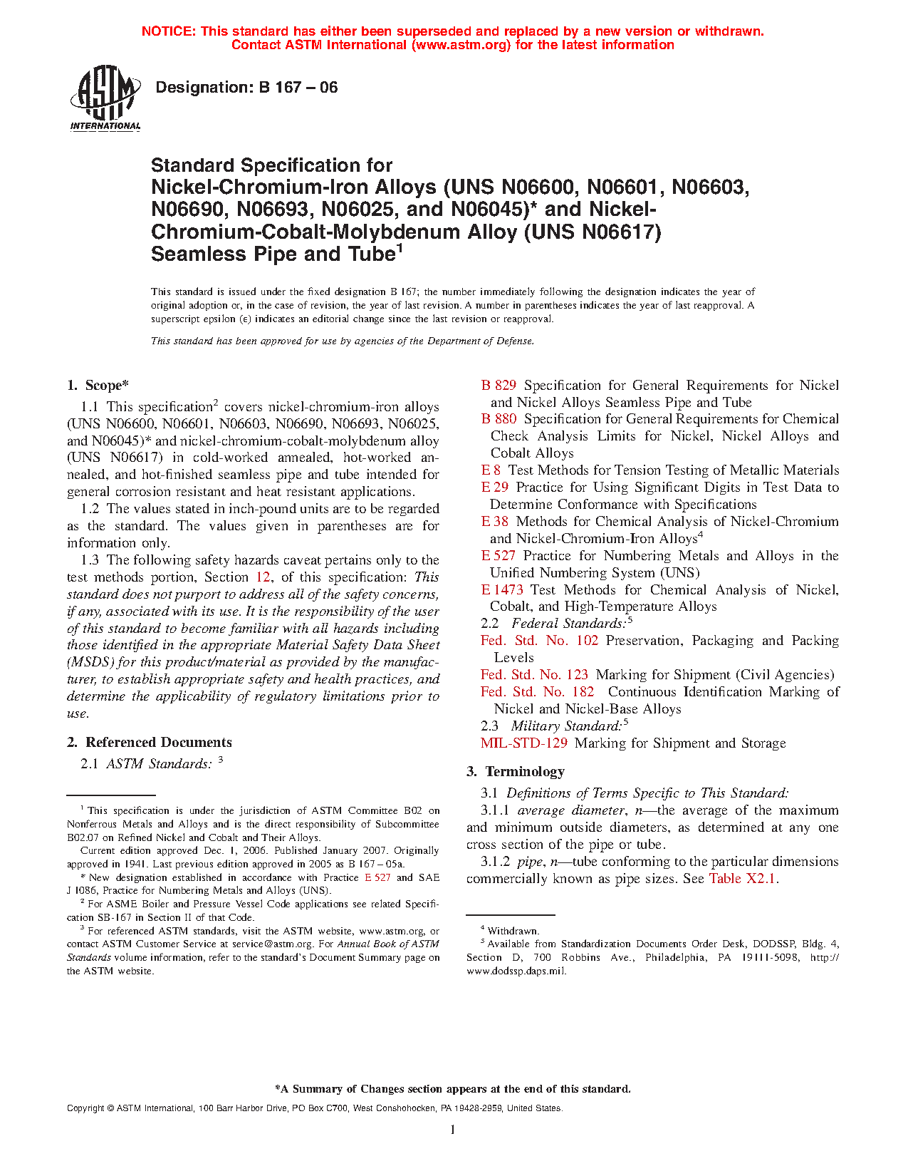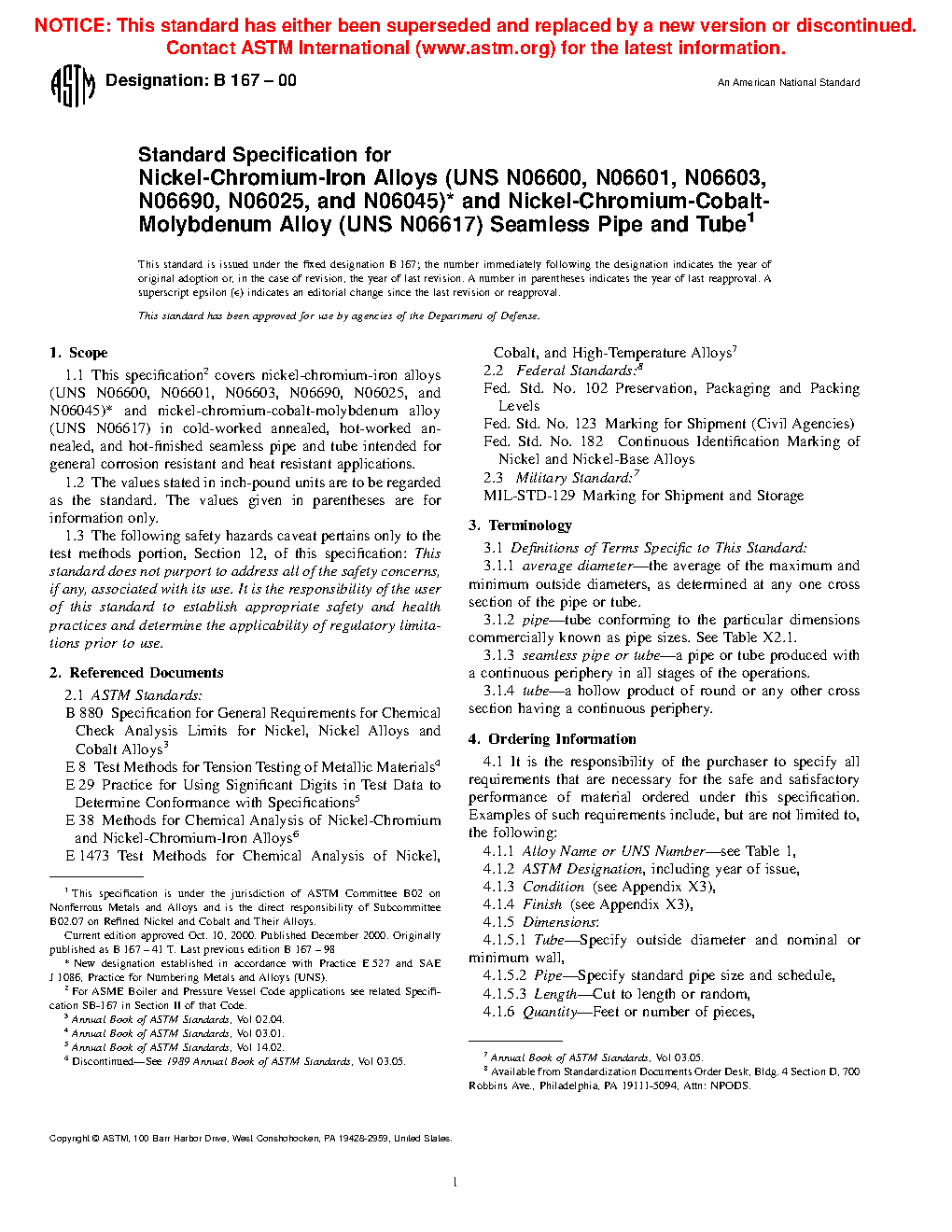This specification covers nickel-chromium-iron alloys (UNS N06600, N06601, N06603, N06690, N06693, N06025, N06045, and N06696) and nickel-chromium-cobalt molybdenum alloy (UNS N06617) in cold-worked annealed, hot-worked annealed, and hot-finished seamless pipe and tube intended for general corrosion resistant and heat resistant applications. The material shall conform to the required chemical composition for nickel, chromium, iron, manganese, molybdenum, cobalt, aluminum, carbon, copper, boron, silicon, sulfur, titanium, niobium, phosphorous, zirconium, yttrium, and cerium. The following test methods shall be performed on the alloys, namely: chemical analysis, tension test, and hydrostatic or nondestructive electric test. The material shall conform to the required mechanical properties such as tensile strength, yield strength, elongation, nondestructive electric test, and rounding method.