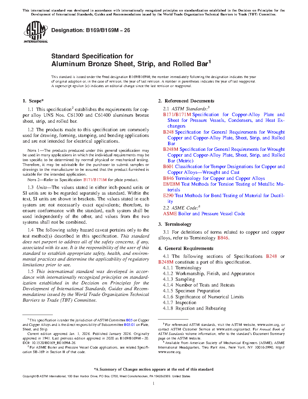 1.1 This specification2 establishes the requirements for Copper Alloy UNS Nos. C61300 and C61400 aluminum bronze sheet, strip, and rolled bar.