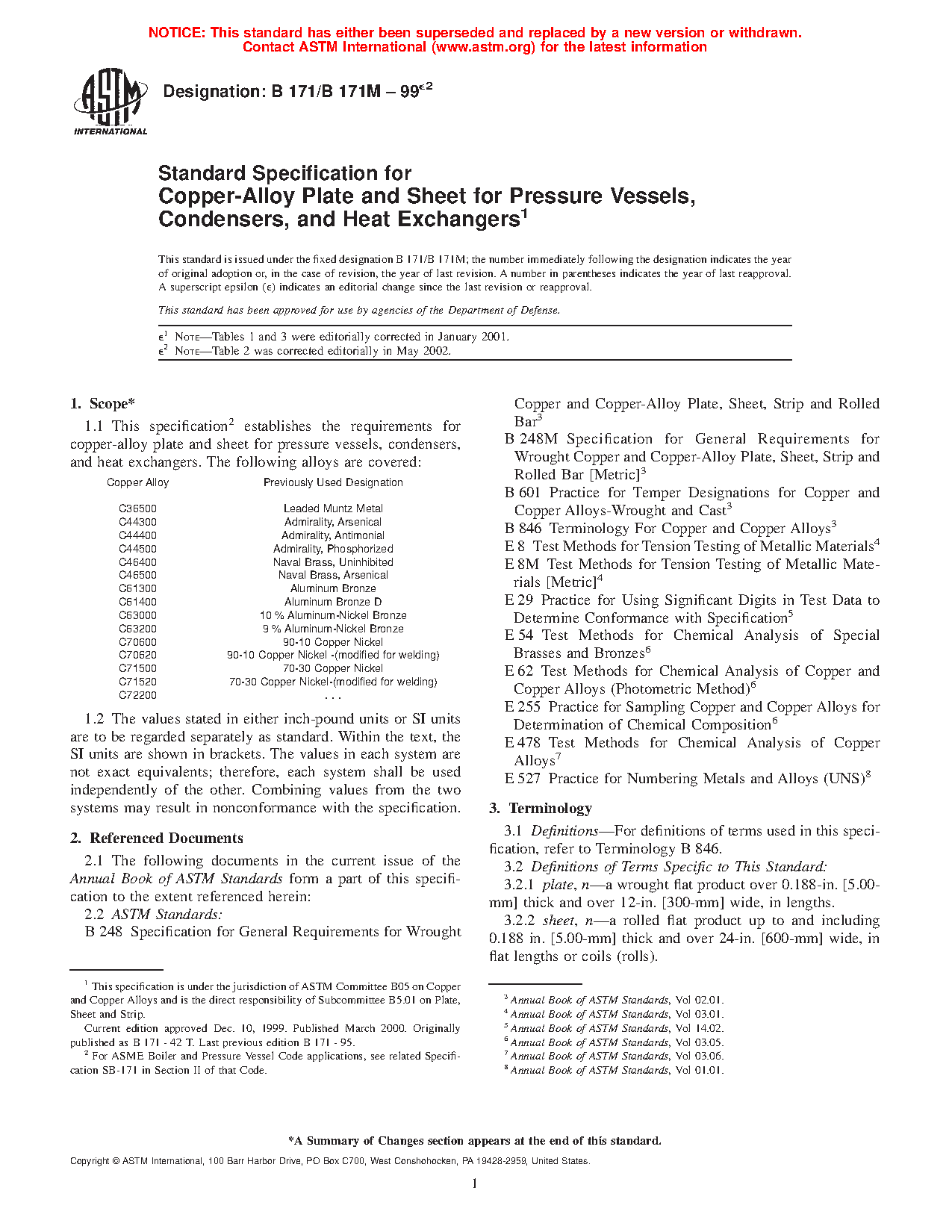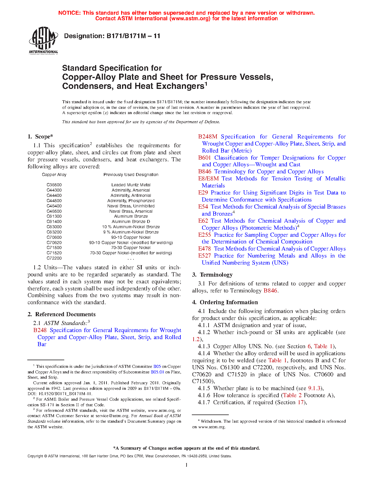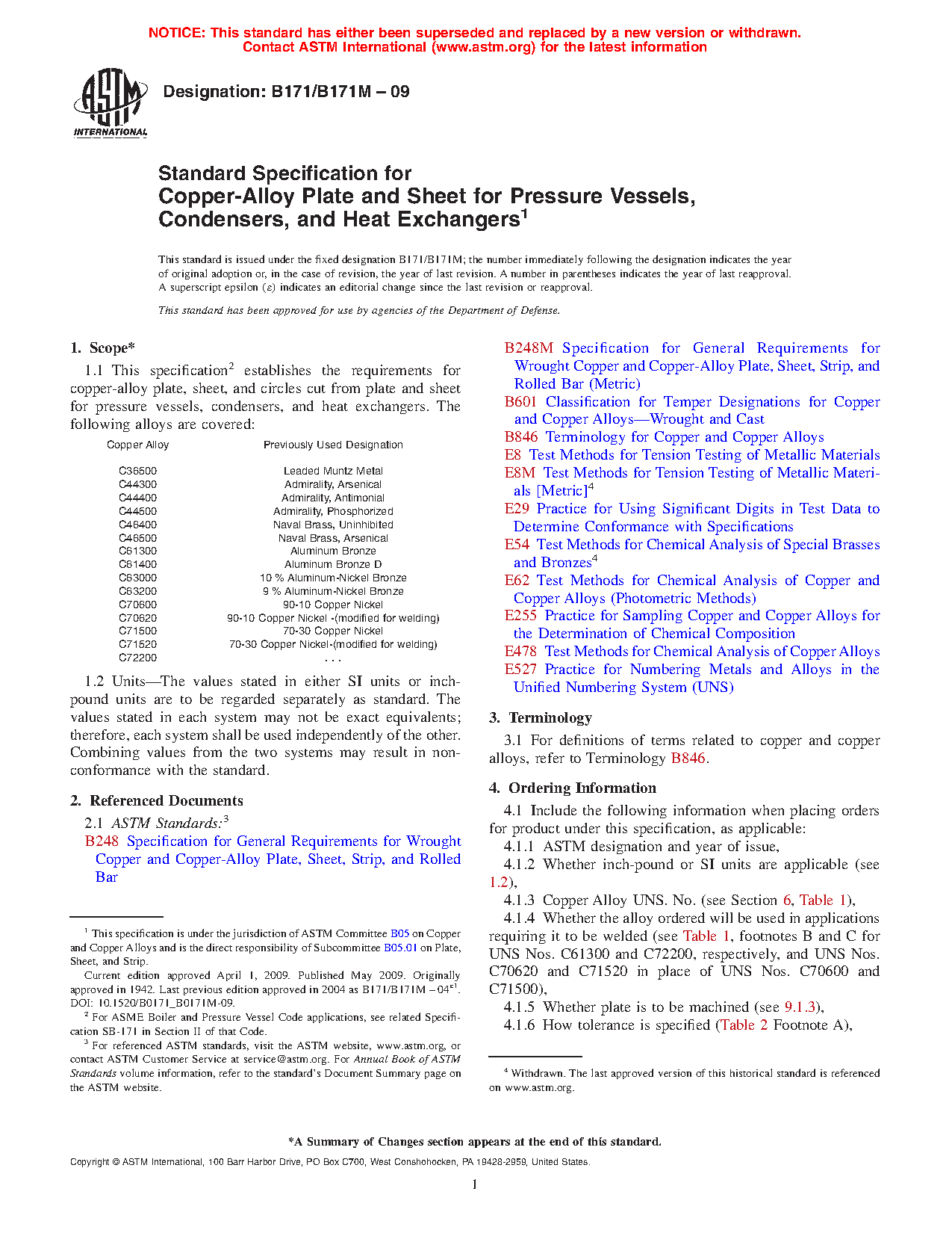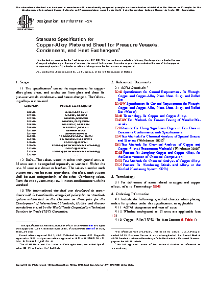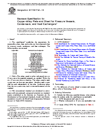 1.1 This specification2 establishes the requirements for copper-alloy plate, sheet, and circles cut from plate and sheet for pressure vessels, condensers, and heat exchangers. The following alloys are covered: