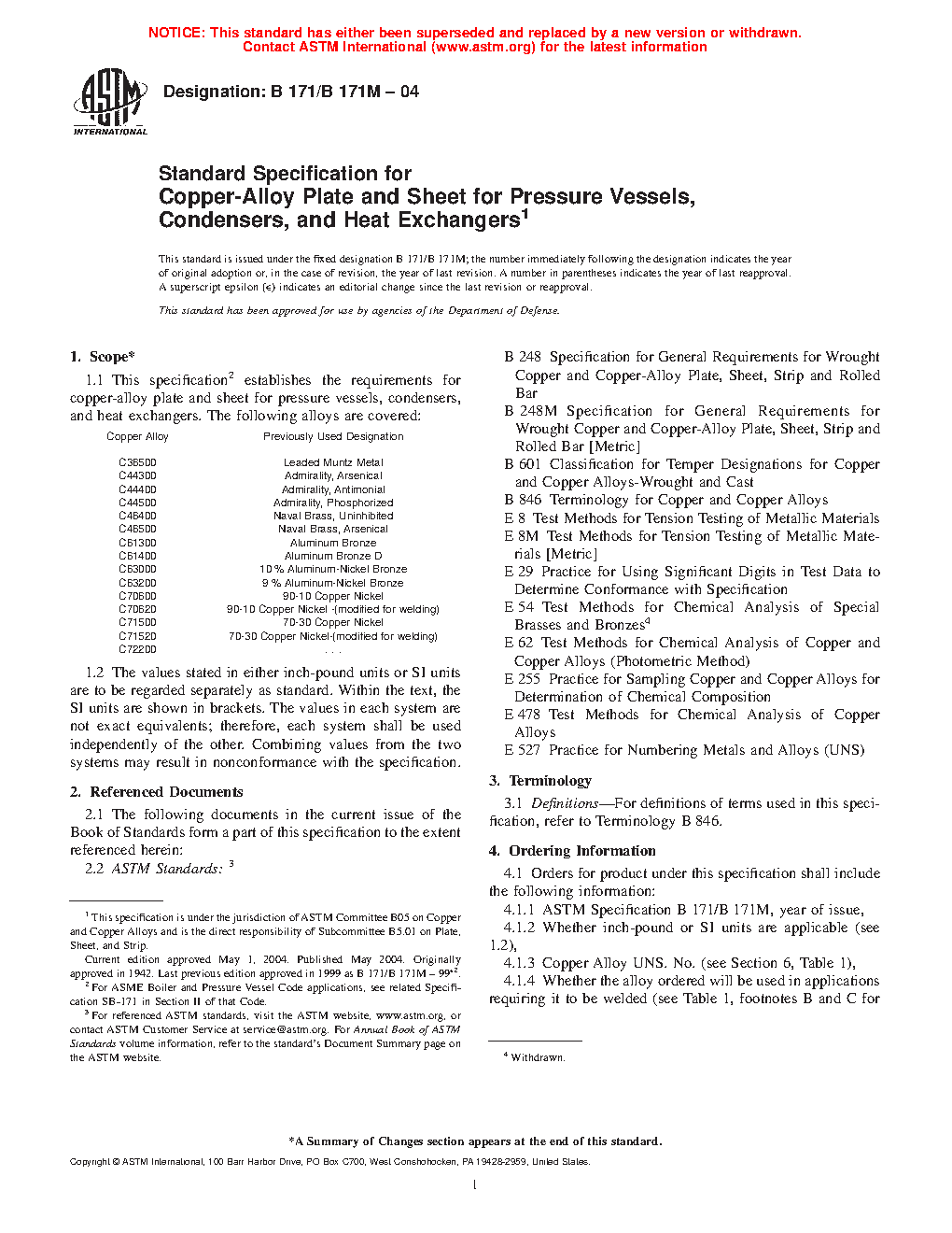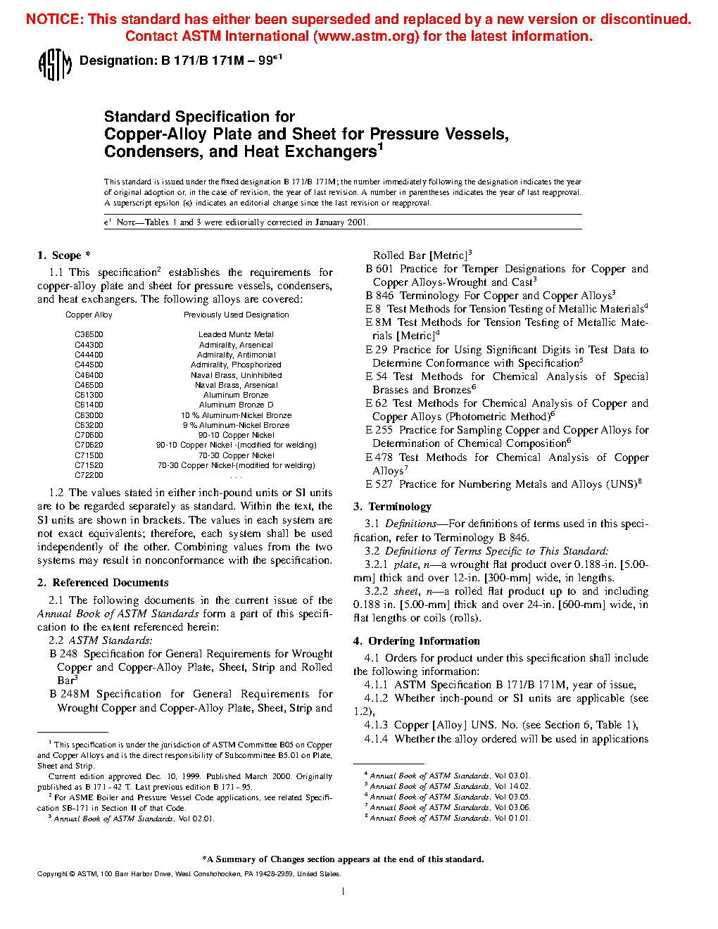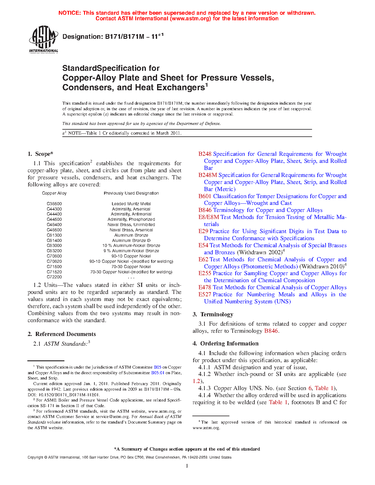 1.1 This specification2 establishes the requirements for copper-alloy plate, sheet, and circles cut from plate and sheet for pressure vessels, condensers, and heat exchangers. The following alloys are covered: