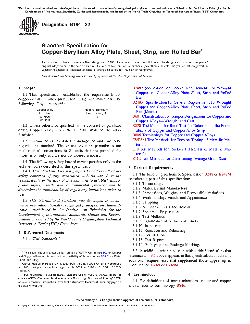 1.1 This specification establishes the requirements for copper-beryllium alloy plate, sheet, strip, and rolled bar. The following alloys are specified: