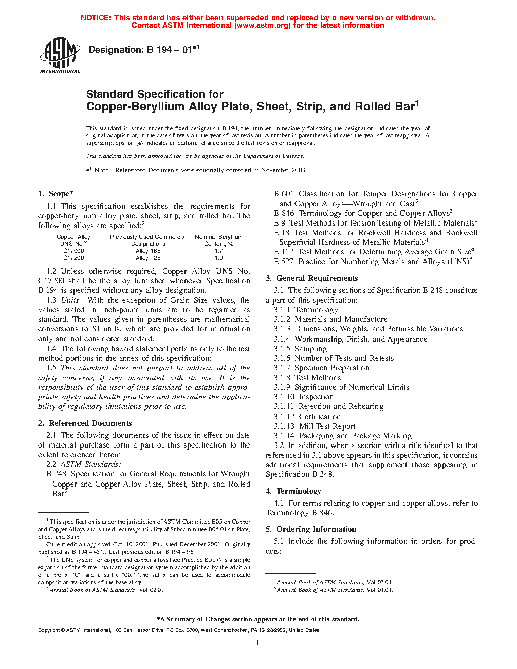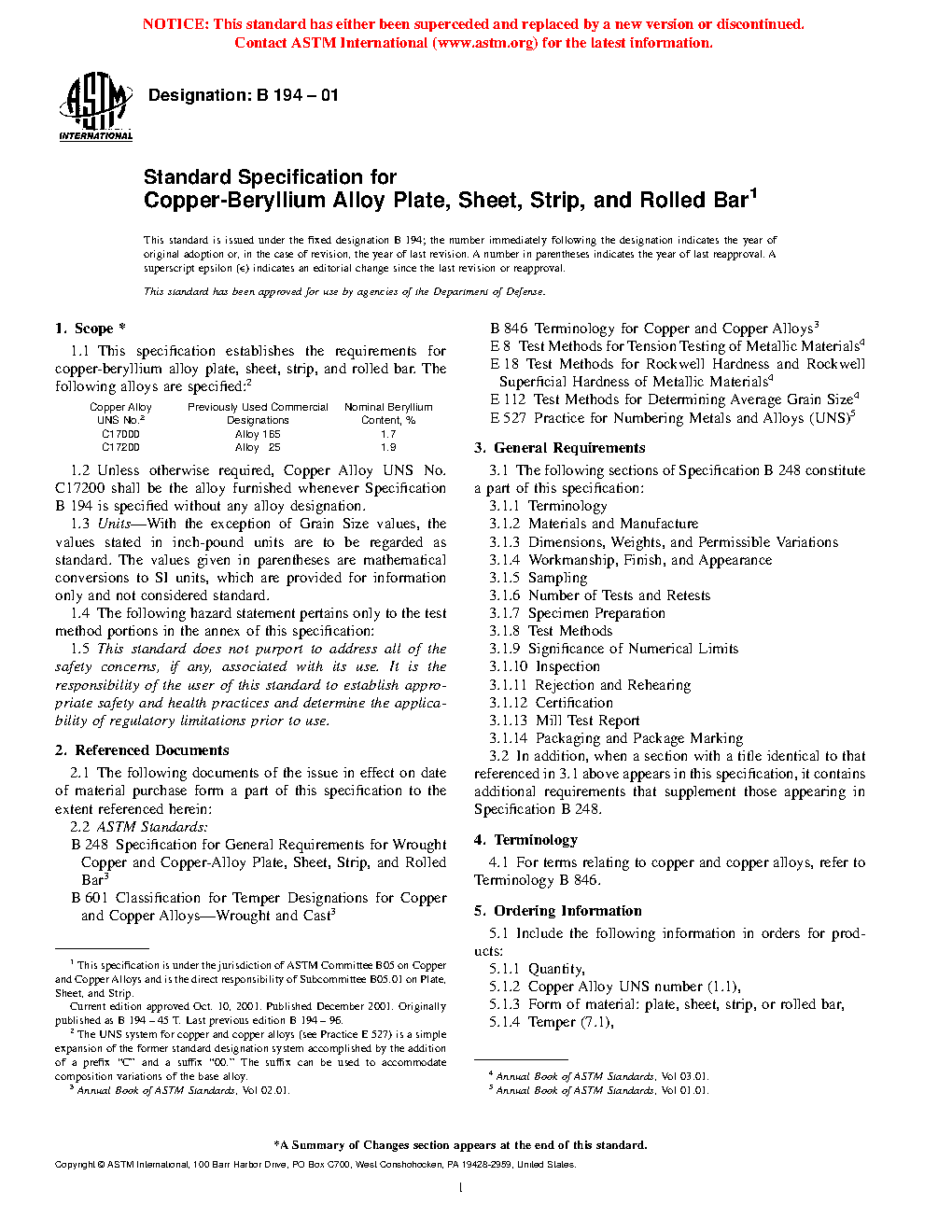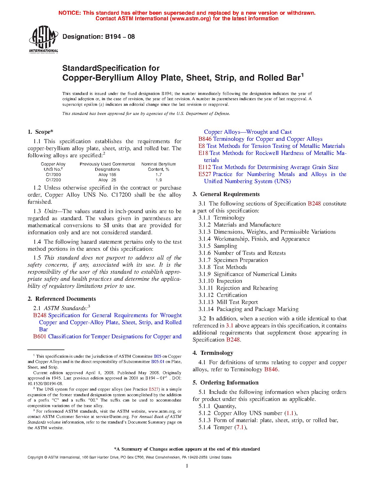 1.2 Unless otherwise required, Copper Alloy UNS No. C17200 shall be the alloy furnished whenever Specification B 194 is specified without any alloy designation.