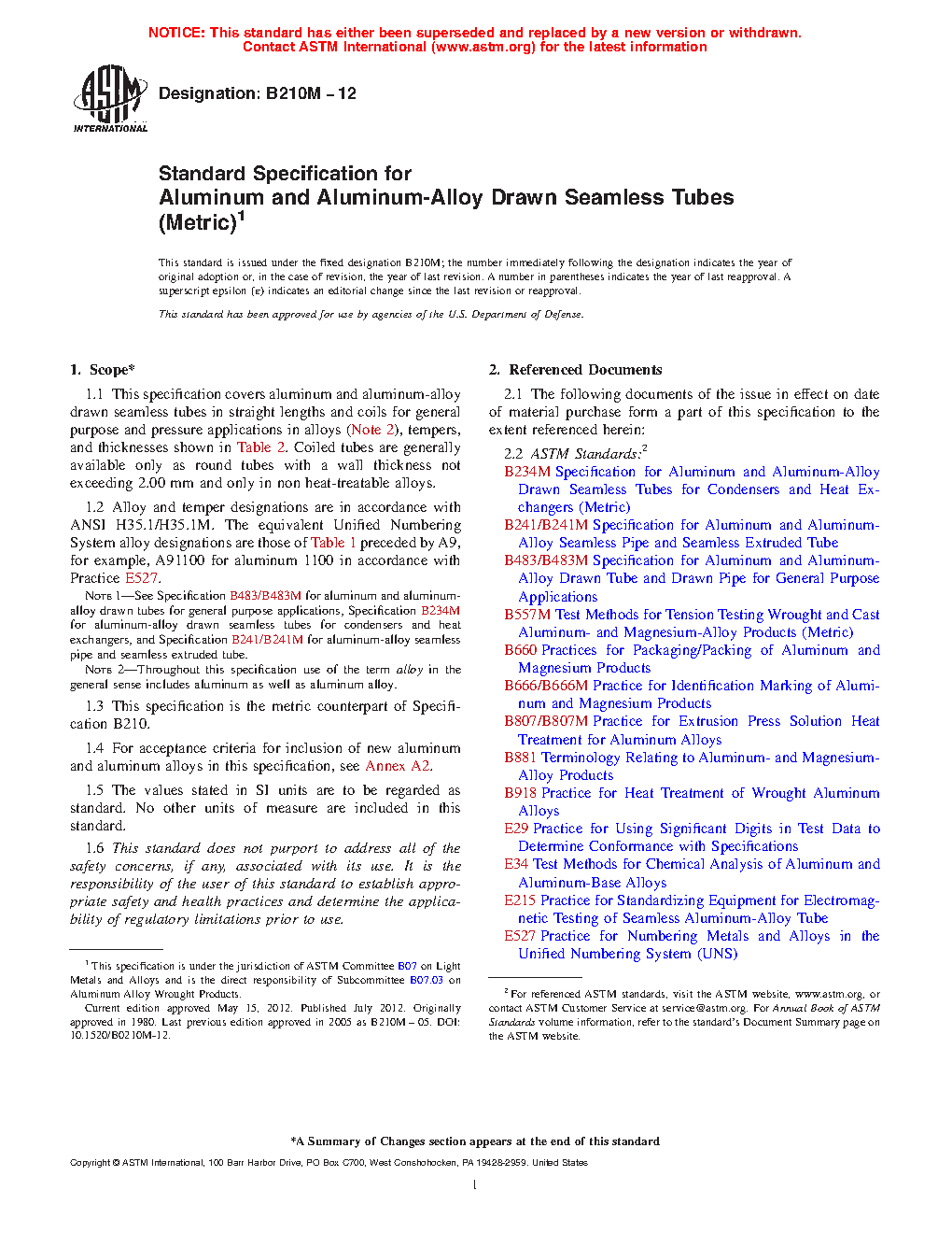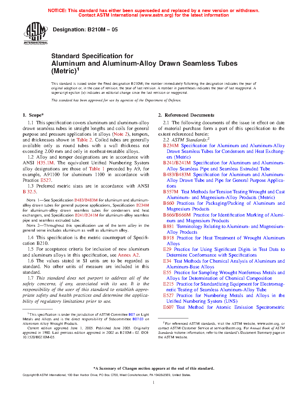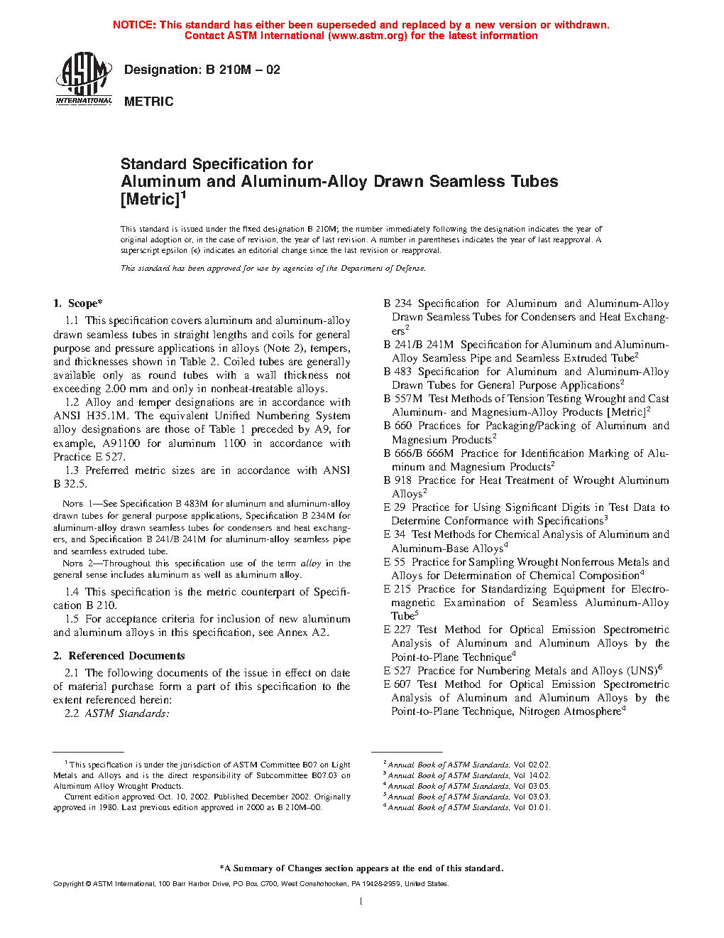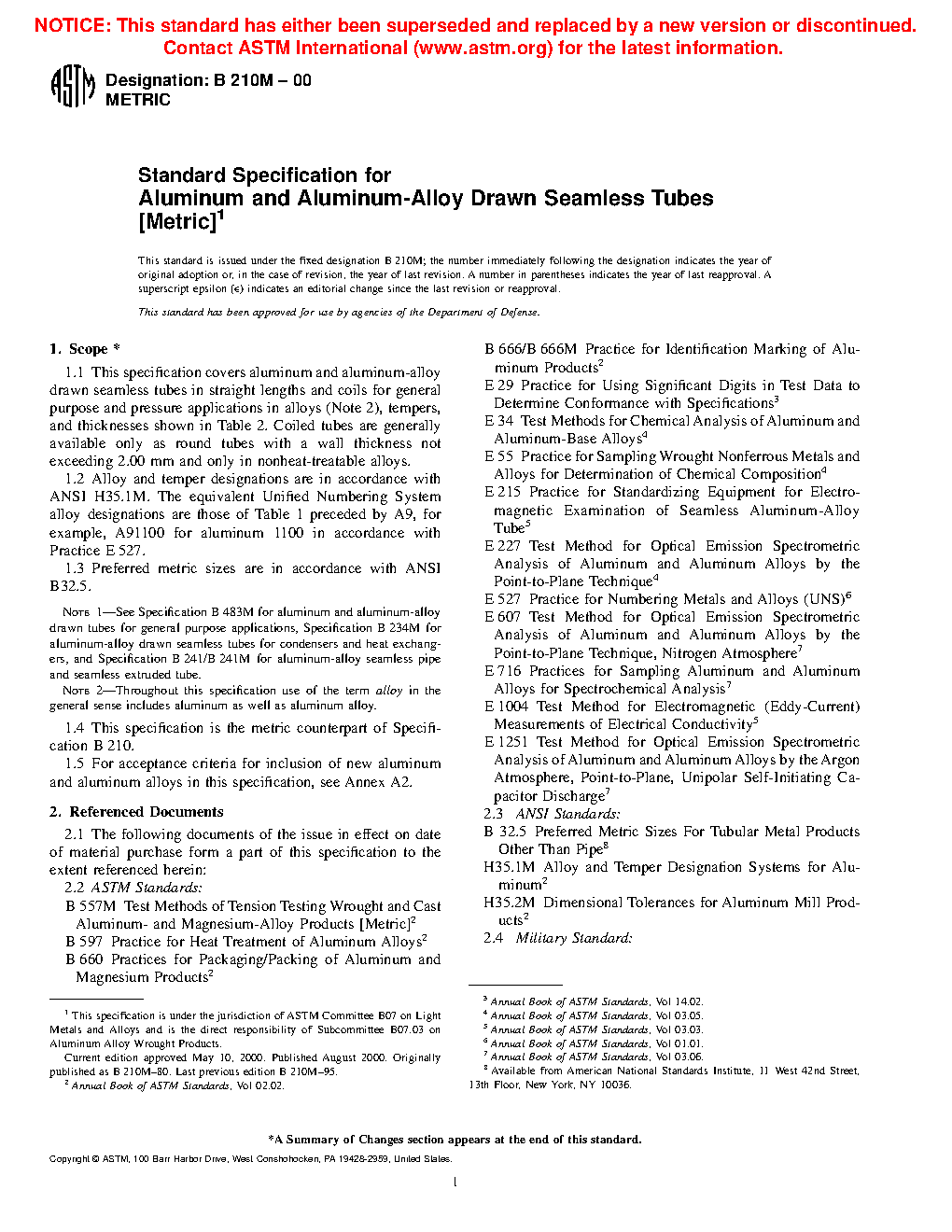 Note 1—See Specification B483/B483M for aluminum and aluminum-alloy drawn tubes for general purpose applications, Specification B234M for aluminum-alloy drawn seamless tubes for condensers and heat exchangers, and Specification B241/B241M for aluminum-alloy seamless pipe and seamless extruded tube.