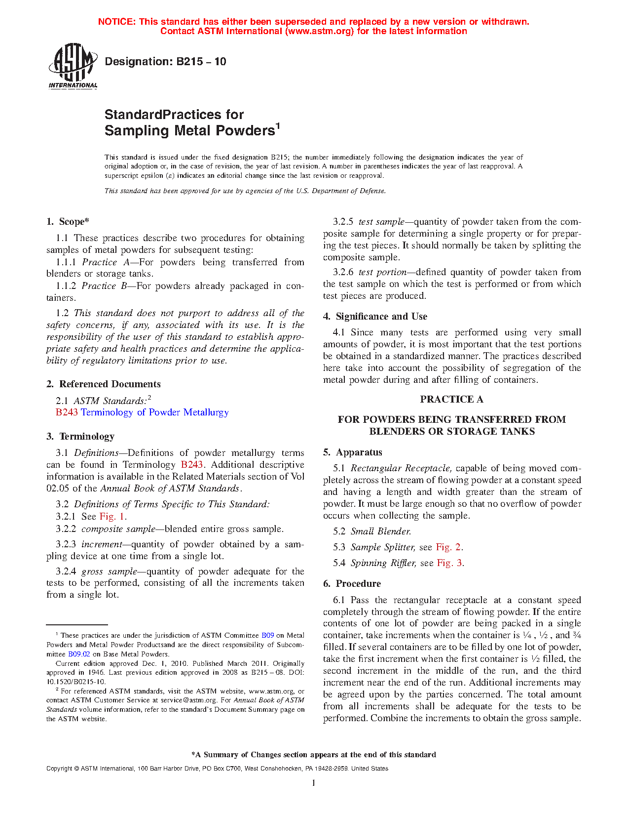 Since many tests are performed using very small amounts of powder, it is most important that the test portions be obtained in a standardized manner. The practices described here take into account the possibility of segregation of the metal powder during and after filling of containers.