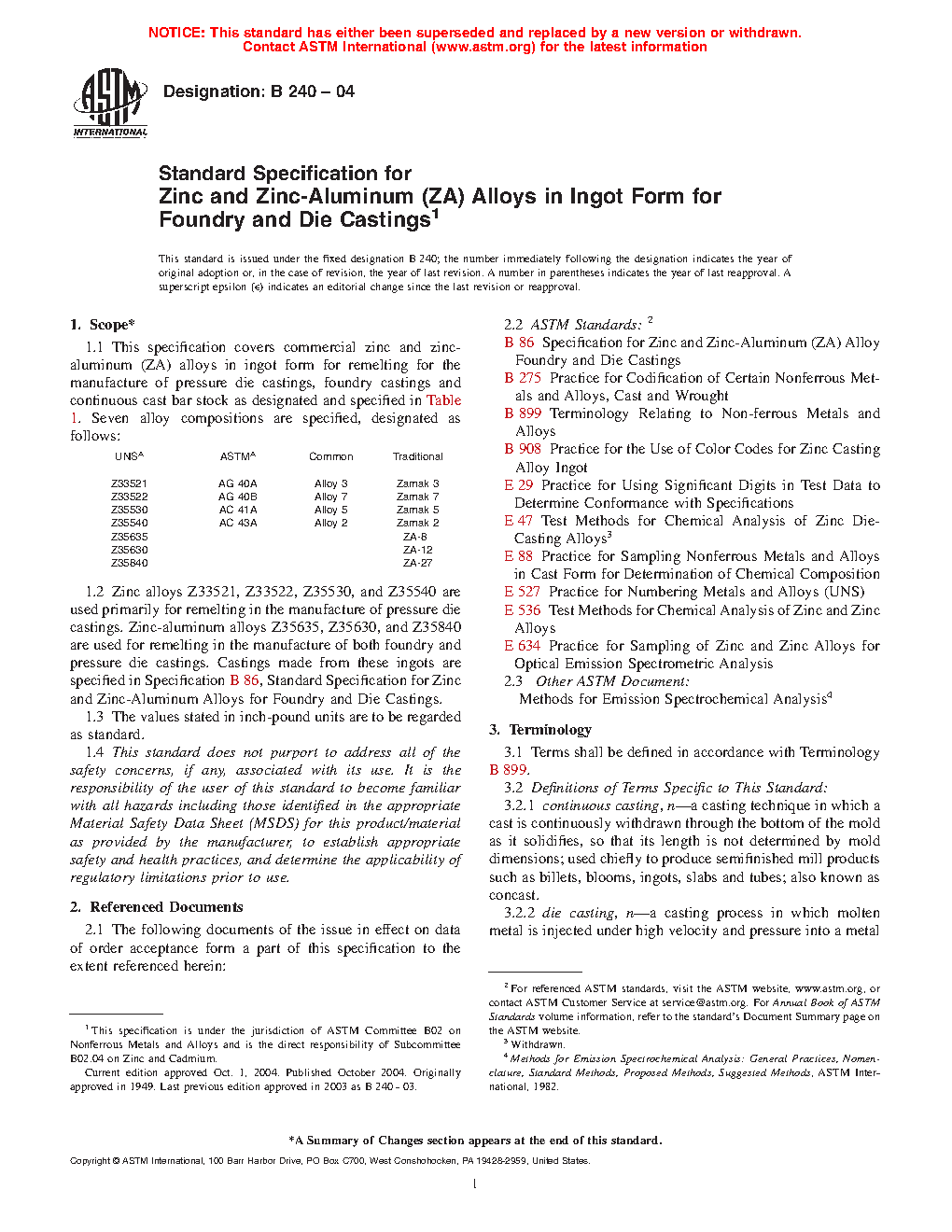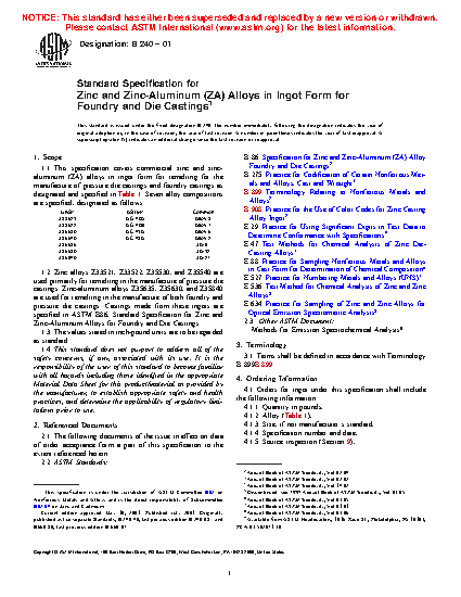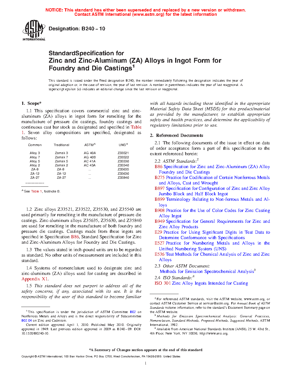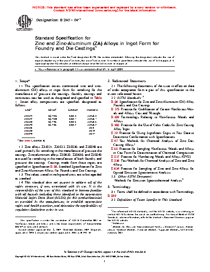 1.1 This specification covers commercial zinc and zinc-aluminum (ZA) alloys in ingot form for remelting for the manufacture of pressure die castings, foundry castings and continuous cast bar stock as designated and specified in Table 1. Seven alloy compositions are specified, designated as follows: