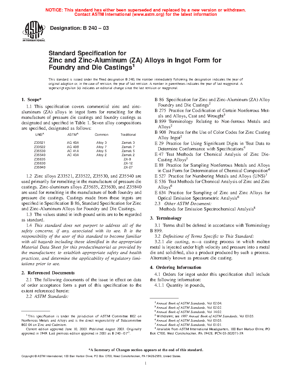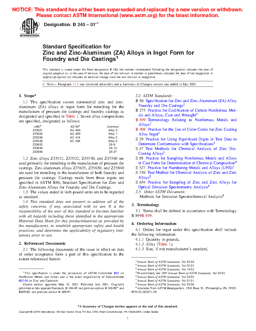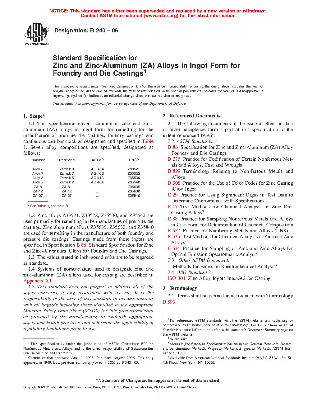 1.1 This specification covers commercial zinc and zinc-aluminum (ZA) alloys in ingot form for remelting for the manufacture of pressure die castings, foundry castings and continuous cast bar stock as designated and specified in Table 1. Seven alloy compositions are specified, designated as follows: