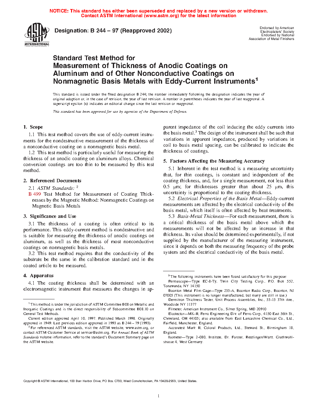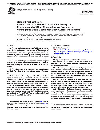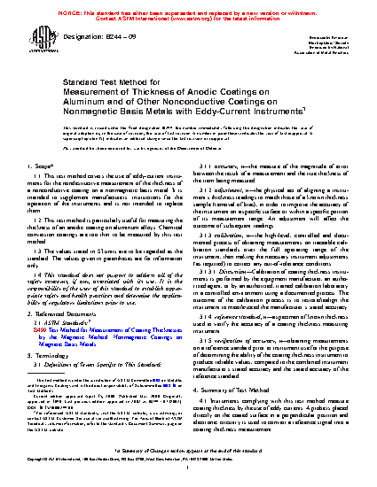 1.1 This test method covers the use of eddy-current instruments for the nondestructive measurement of the thickness of a nonconductive coating on a nonmagnetic basis metal. It is intended to supplement manufacturers’ instructions for the operation of the instruments and is not intended to replace them.