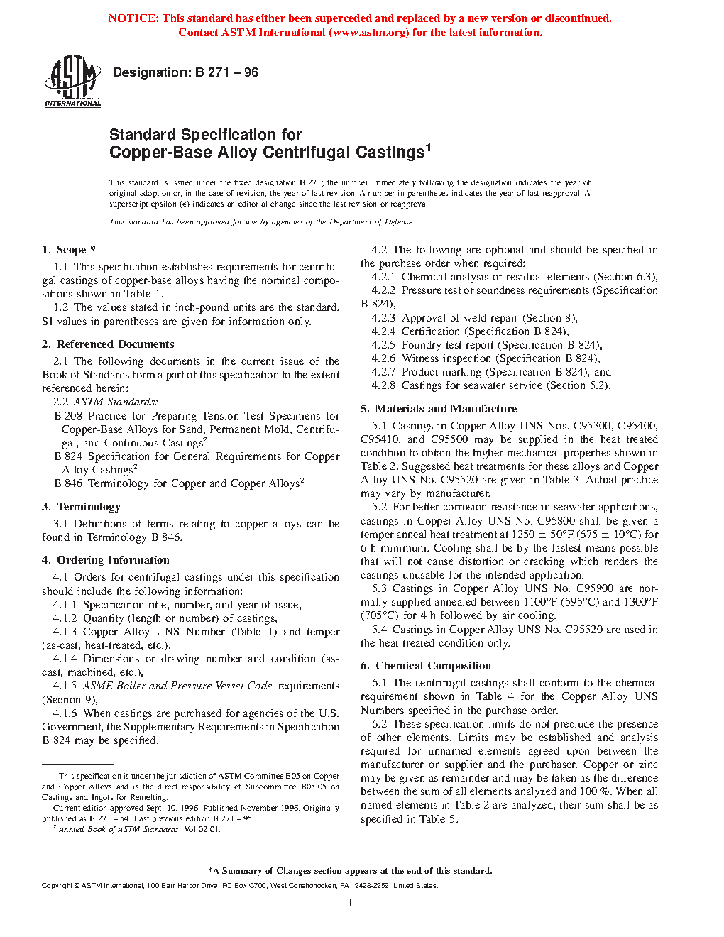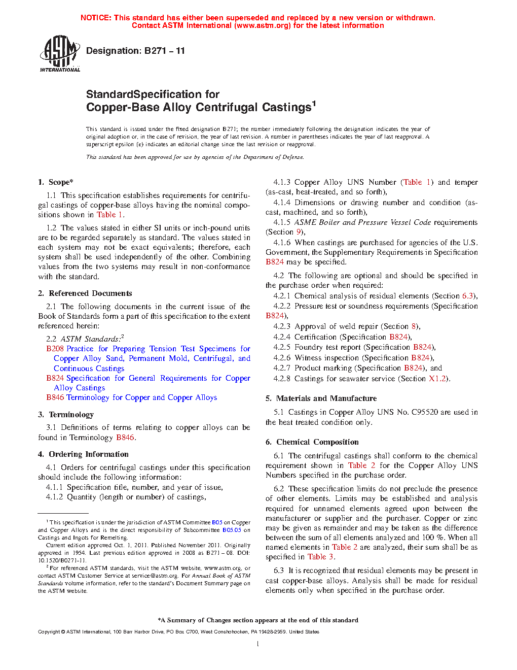 1.1 This specification establishes requirements for centrifugal castings of copper-base alloys having the nominal compositions shown in Table 1.