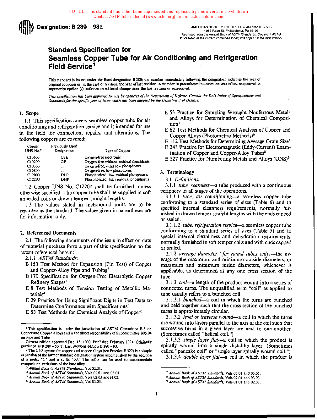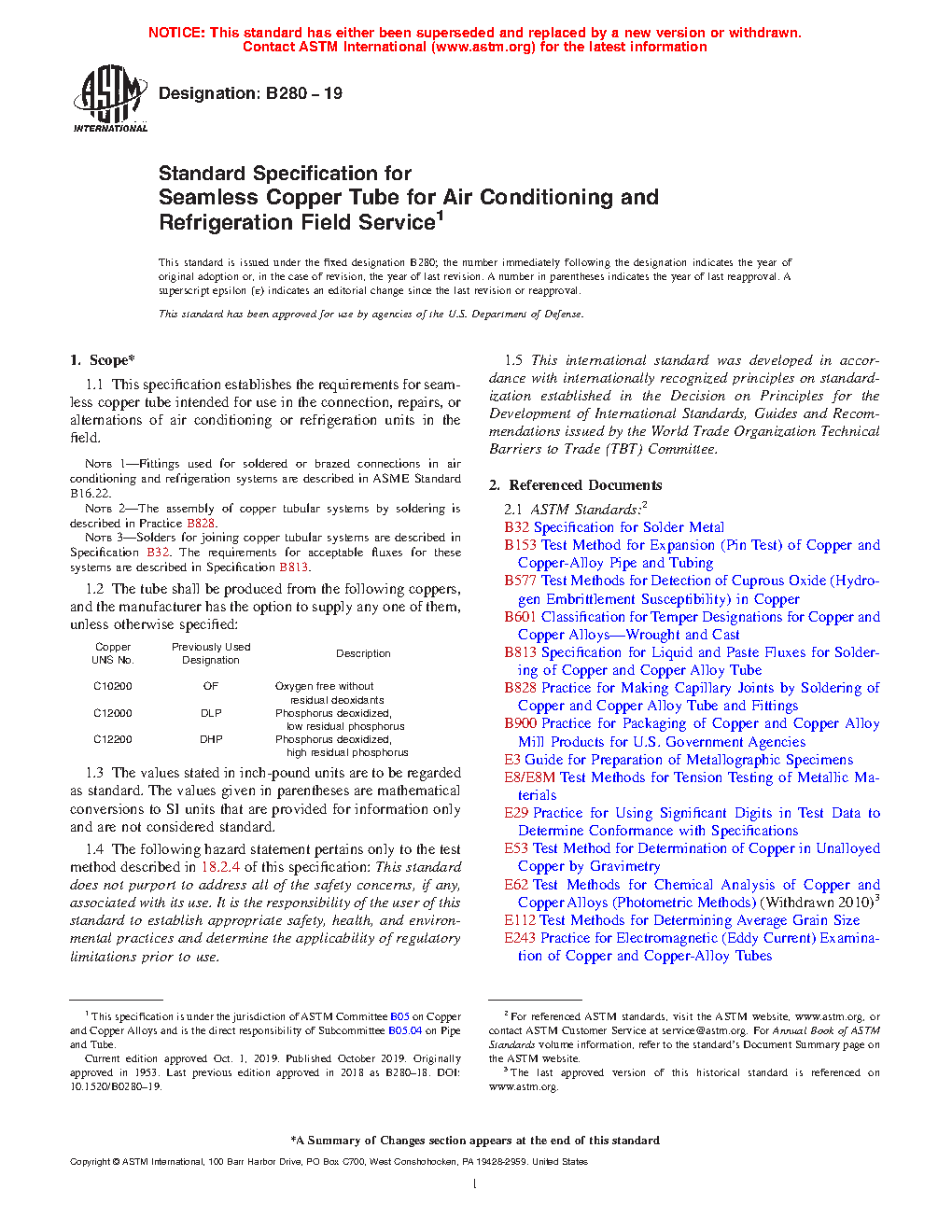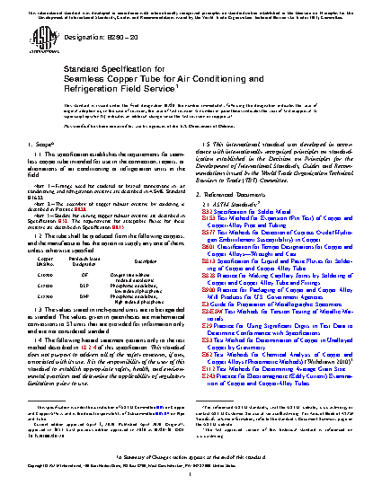 1.1 This specification establishes the requirements for seamless copper tube produced from Copper UNS No. C12200, and intended for use in the connection, repairs, or alterations of air conditioning or refrigeration units in the field.