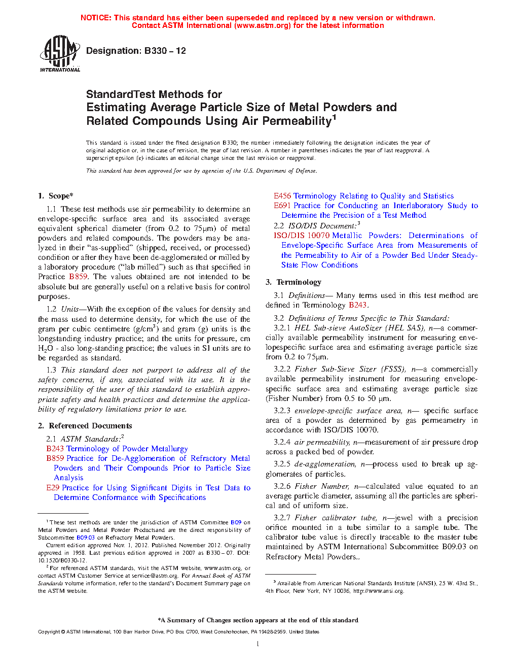 1.1 This test method uses air permeability to determine an envelope-specific surface area and its associated average equivalent spherical diameter (from 1 to 50 m) of metal powders and related compounds. The powders may be analyzed in their "as-supplied" (shipped, received, or processed) condition or after they have been de-agglomerated or milled by a laboratory procedure ("lab milled") such as that specified in Practice B 859. The values obtained are not intended to be absolute but are generally useful on a relative basis for control purposes.