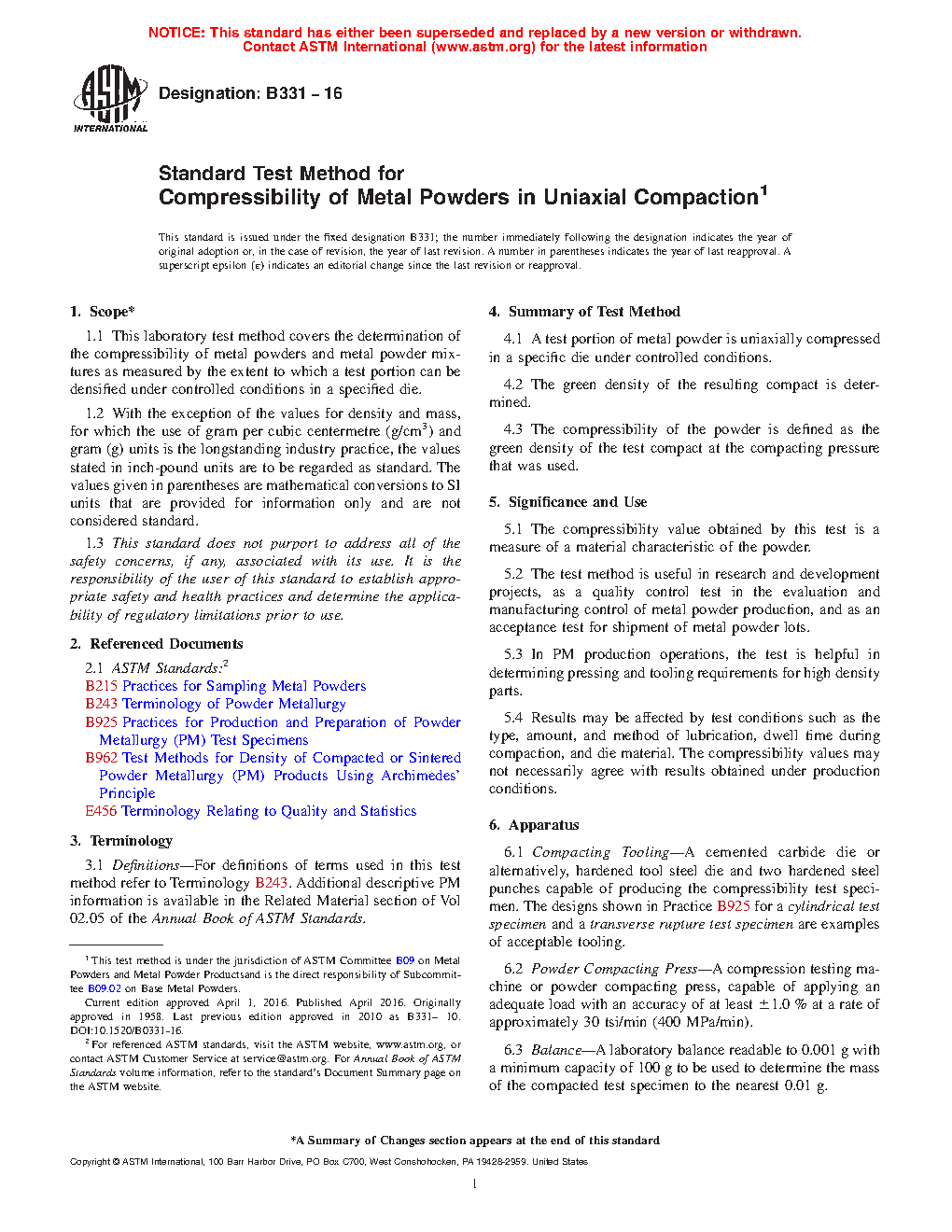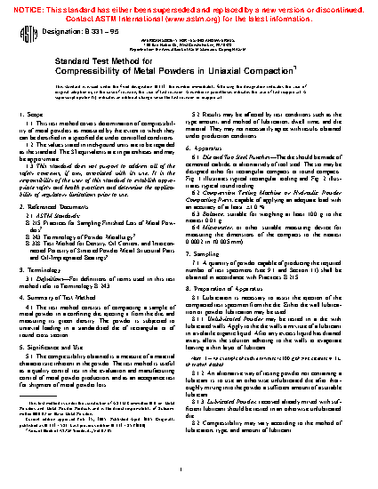 1.1 This test method covers determination of compressibility of metal powders as measured by the extent to which they can be densified in a specified die under controlled conditions.