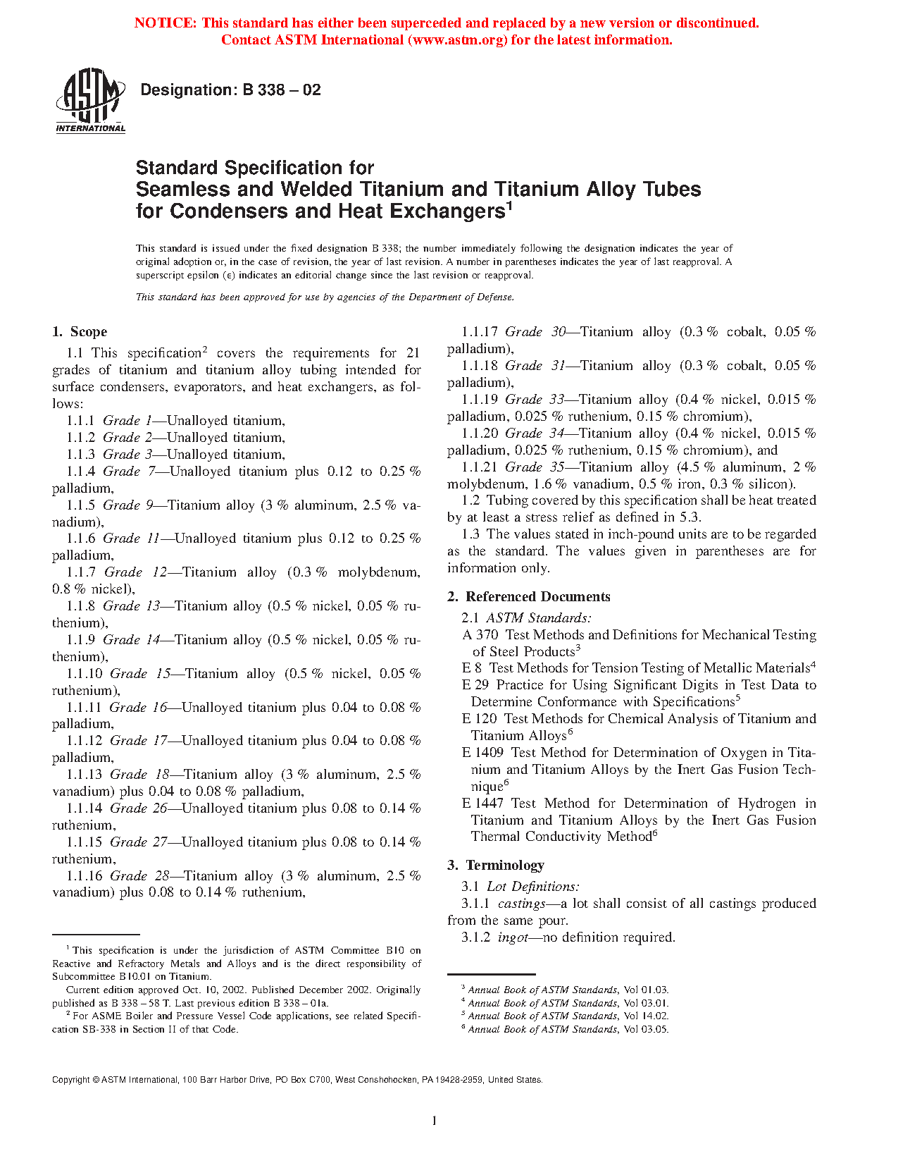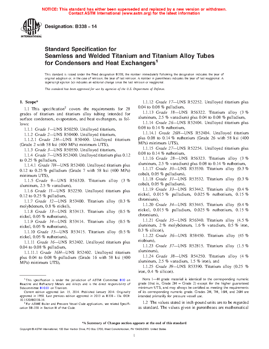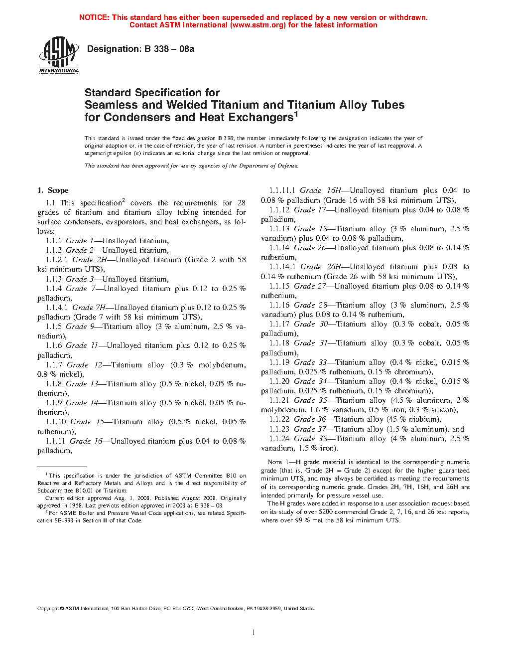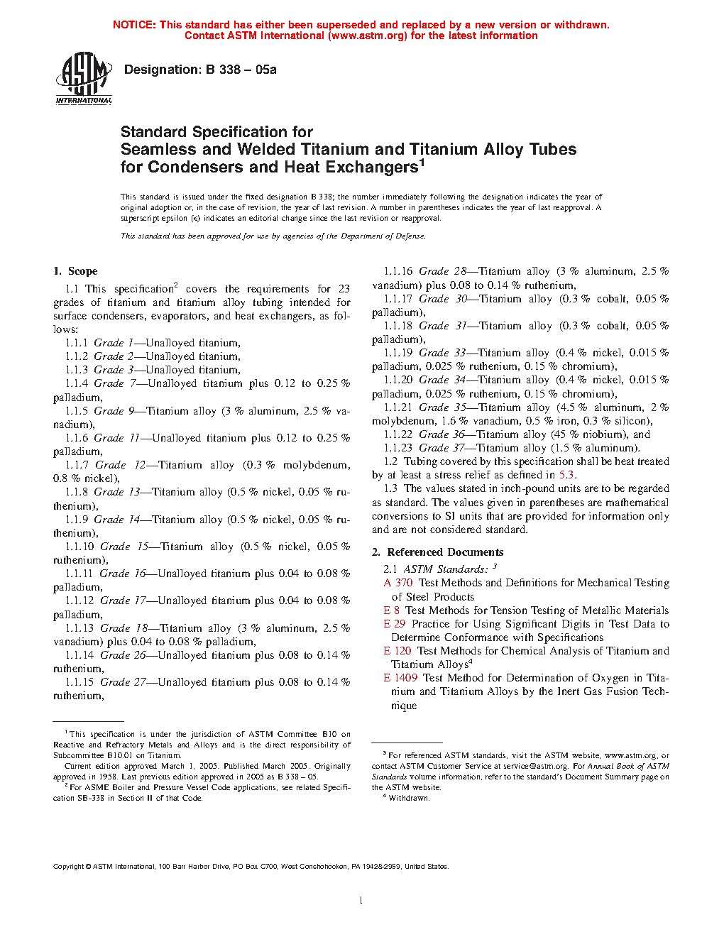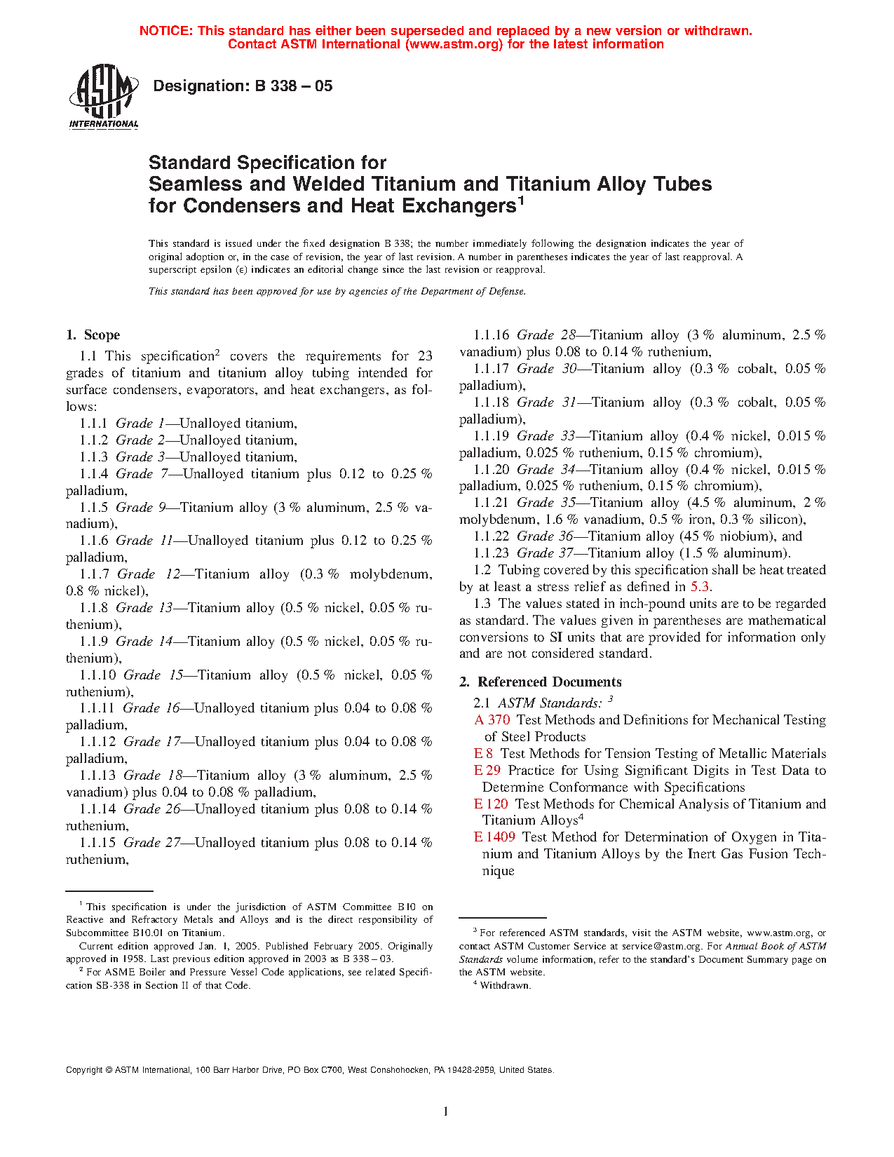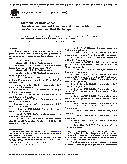 1.1 This specification covers the requirements for 24 grades of titanium and titanium alloy tubing intended for surface condensers, evaporators, and heat exchangers, as follows: