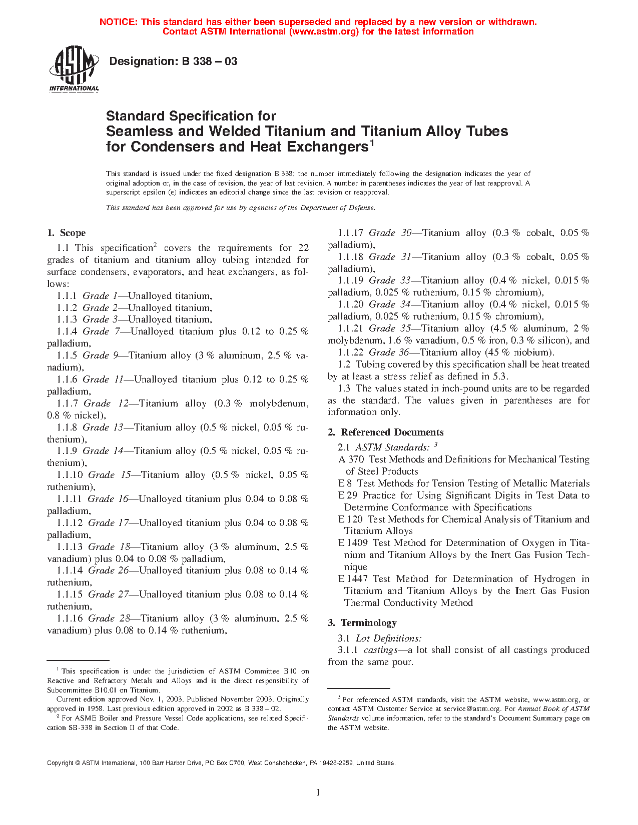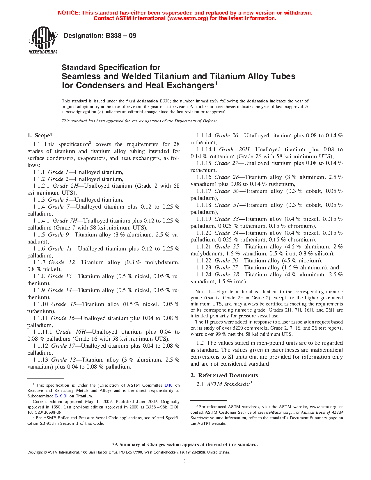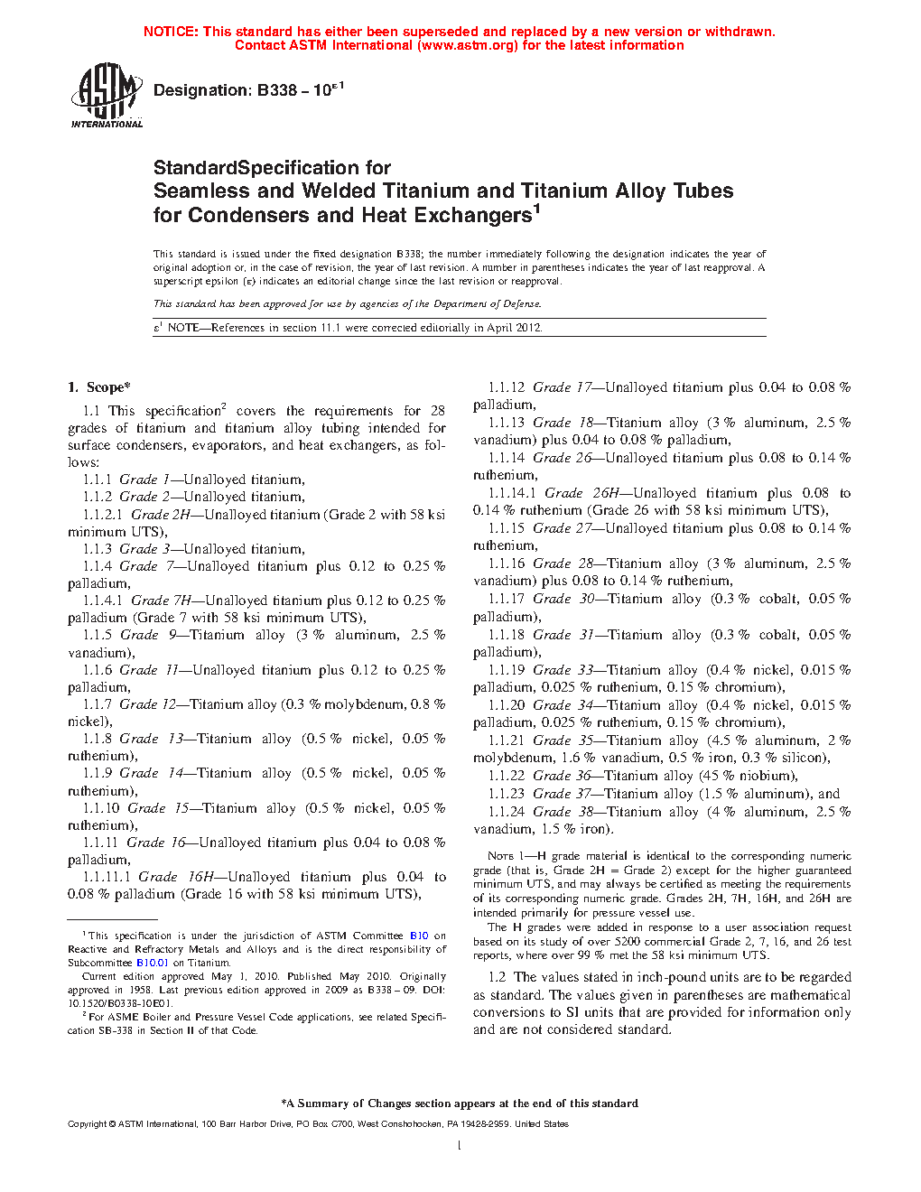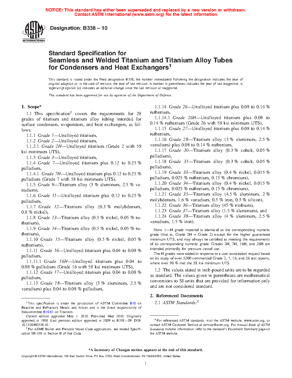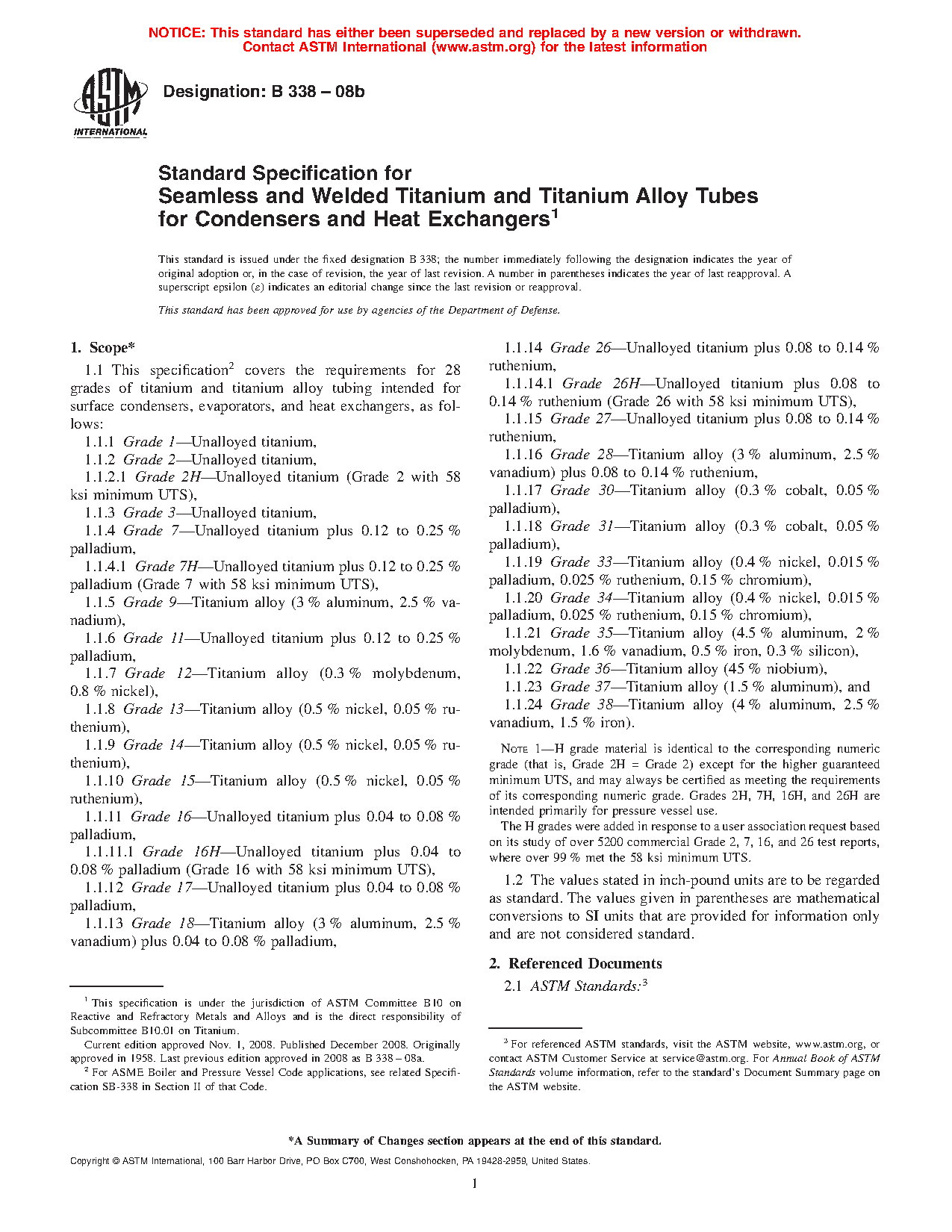 1.1 This specification covers the requirements for 24 grades of titanium and titanium alloy tubing intended for surface condensers, evaporators, and heat exchangers, as follows: