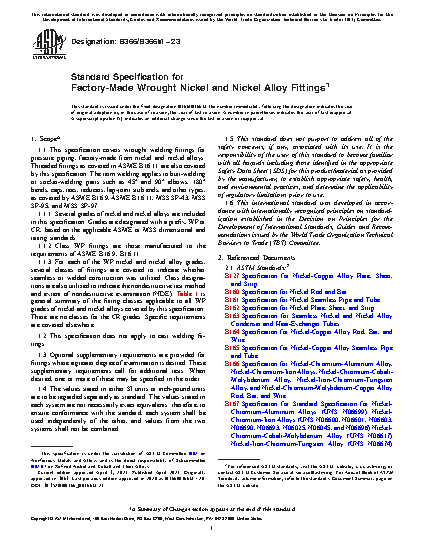 This specification covers wrought welding fittings, including threaded fittings, for pressure piping, factory-made from nickel and nickel alloys. The term welding applies to butt-welding or socket-welding parts such as elbows, bends, caps, tees, reducers, lap-joint, and stub ends. This specification does not apply to cast welding fittings. Grades of nickel and nickel alloys included in this specification are designated with a prefix, WP or CR, based on dimensional and rating standards. WP grades have class designations (Class S, Class W, Class WX, and Class WU) to indicate whether seamless or welded construction is utilized and to indicate the nondestructive test method and extent of nondestructive examination (such as radiography and/or ultrasonic test). The material for wrought welding fittings may consist of forgings, rods, bars, plates, sheets, and seamless or welded pipe that conform to all the specified requirements. Forging or shaping operations may be performed by hammering, pressing, piercing, extruding, upsetting, rolling, bending, or fusion welding, or by a combination of two or more of these operations. Chemical and product analyses shall conform to the chemical composition prescribed. Requirements for tensile properties, heat treatment, tension test, and dimensions are detailed. Hydrostatic testing of wrought fittings is not required by this specification.