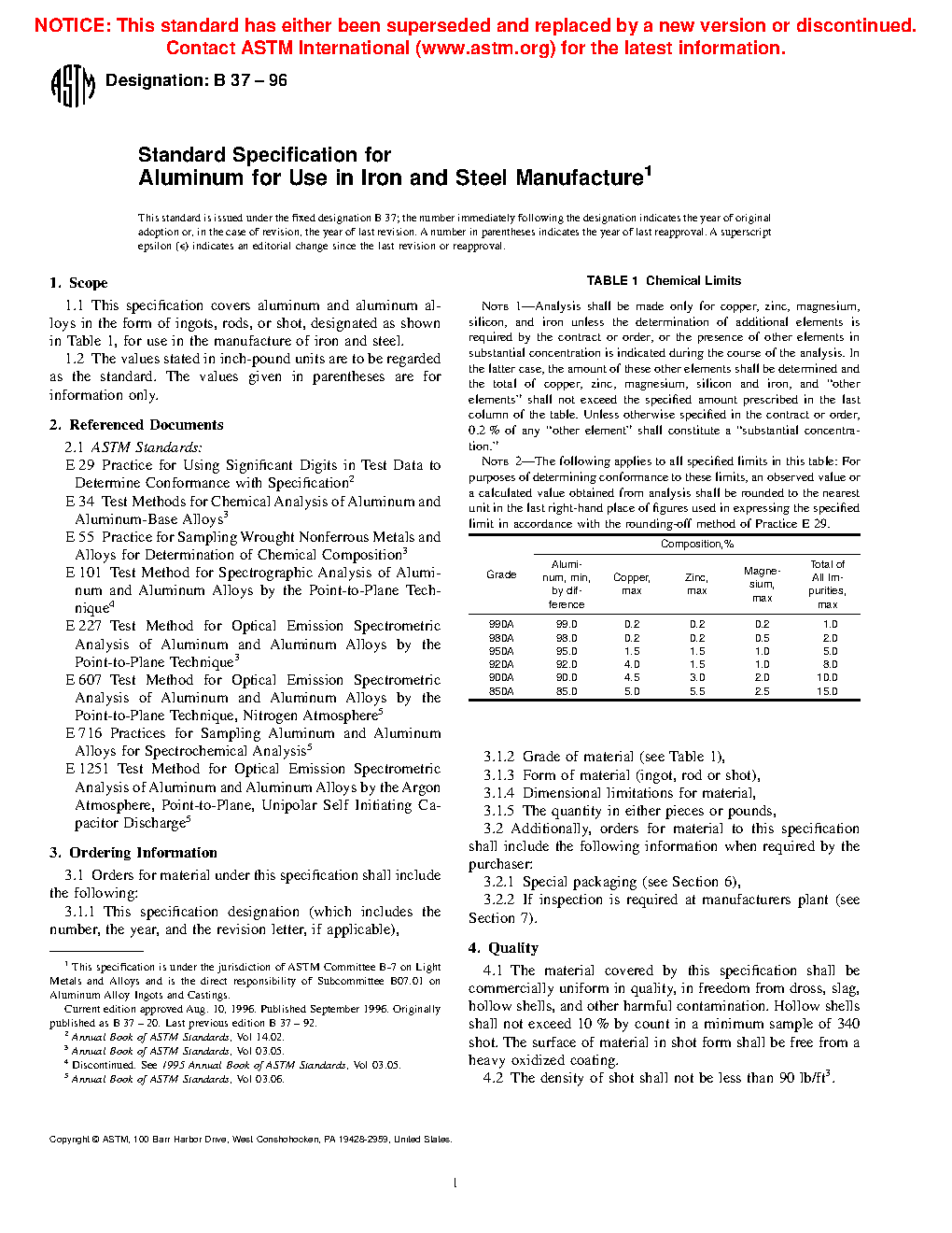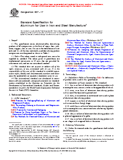 1.1 This specification covers aluminum and aluminum alloys in the form of ingots, bars, rods, cones, nuggets or shot, designated as shown in Table 1, for use in the manufacture of iron and steel.
