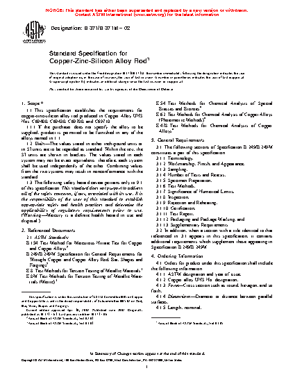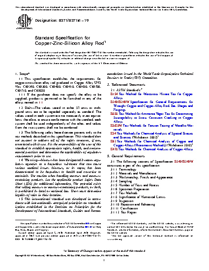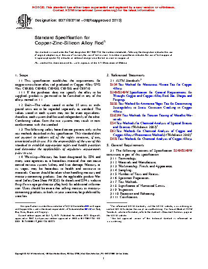 1.1 This specification establishes the requirements for copper-zinc-silicon alloy rod produced in Copper Alloy UNS Nos. C69240, C69300, C69400, C69410, C69430, C69700, C69710, and C69850.