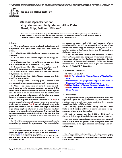 This specification covers unalloyed molybdenum and molybdenum alloy plate, sheet, strip, and foil as follows: Molybdenum 360; Molybdenum 361; Molybdenum Alloy 363; Molybdenum Alloy 364; Molybdenum 365; and Molybdenum Alloy 366. The various molybdenum mill products covered by this specification shall be formed with the conventional extrusion, forging, or rolling equipment normally found in primary ferrous and nonferrous plants. The ingot metal for Molybdenum 360 and 365 and Molybdenum Alloys 363 and 366 is vacuum arc-melted in furnaces of a type suitable for reactive, refractory metals. For Molybdenum 361 and Molybdenum Alloy 364, the metal is consolidated by powder metallurgy methods. The molybdenum and molybdenum alloy ingots and billets for conversion to finished products covered by this specification shall conform to the chemical composition requirements for carbon, oxygen, nitrogen, iron, nickel, silicon, titanium, tungsten, zirconium, and molybdenum. The material shall conform to the mechanical property requirements for tensile strength, yield strength, elongation, and minimum bend radius.