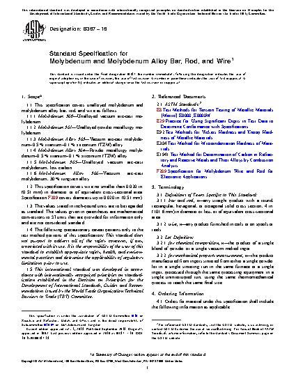 1.1 This specification covers unalloyed molybdenum and molybdenum alloy bar, rod, and wire as follows: