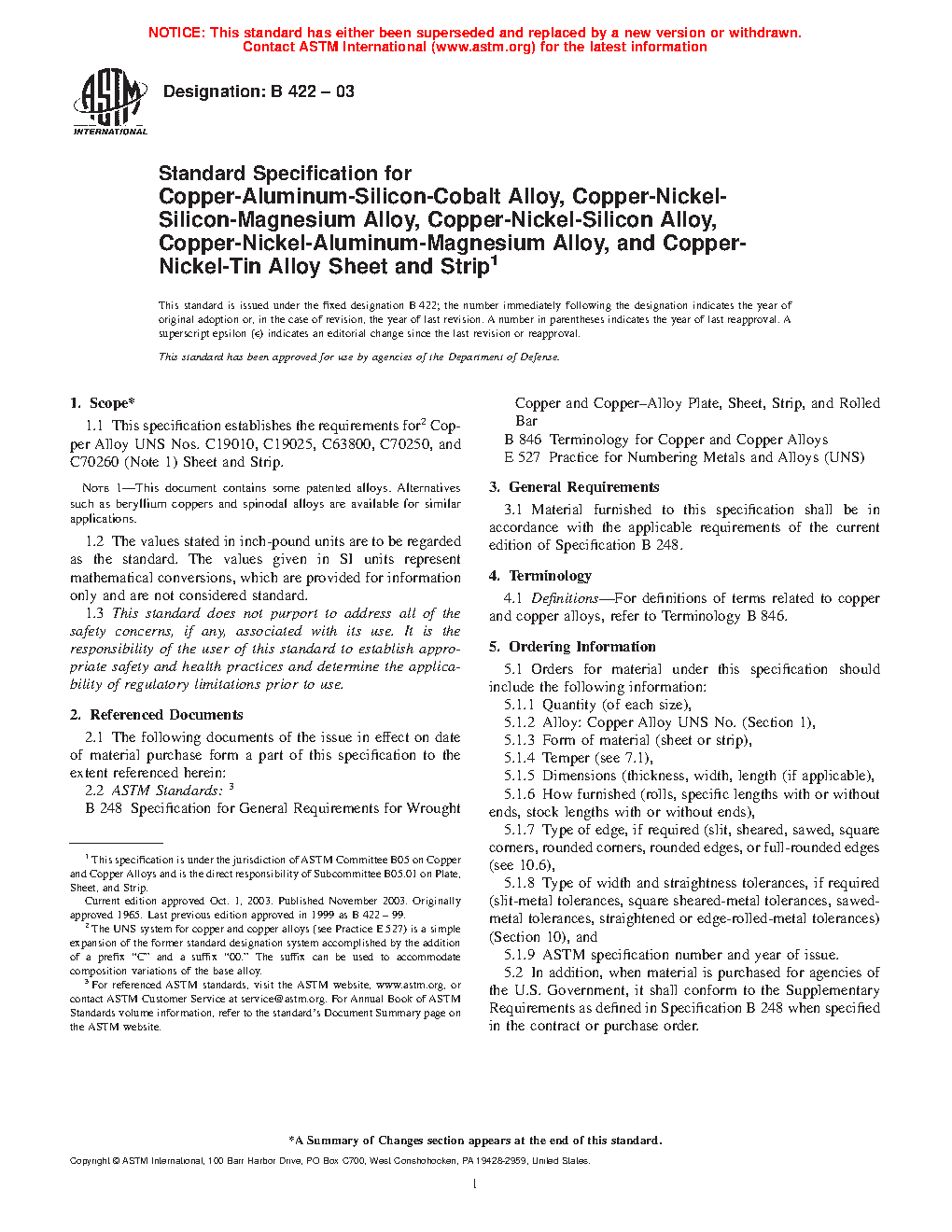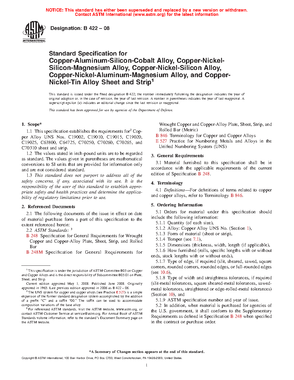 1.1 This specification establishes the requirements for Copper Alloy UNS Nos. C19002, C19010, C19015, ,C19020, C19025, C63800, C64725, C70250, C70260, C70265, and C70310 sheet and strip.