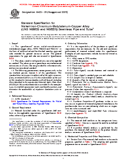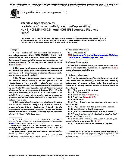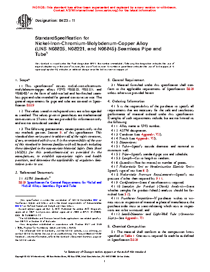 1.1 This specification2 covers nickel-iron-chromium-molybdenum-copper alloys3 in the form of cold-worked and hot-finished seamless pipe and tube intended for general corrosive service. The general requirements for pipe and tube are covered in Specification B829.