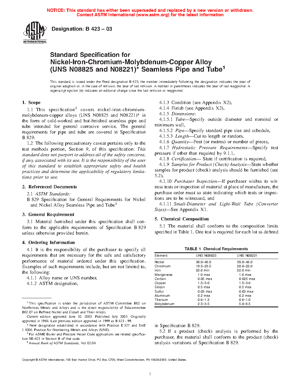 This specification covers nickel-iron-chromium-molybdenum-copper alloys (UNS N08825 and UNS N08221) in the form of cold-worked and hot-finished seamless pipe and tube intended for general corrosive service. Material furnished under this specification shall conform to the applicable requirements specified. Chemical composition limits of the material such as nickel, chromium, iron, manganese, carbon, copper, silicon, sulfur, aluminum titanium, and molybdenum shall conform to the chemical requirements of this specification. Tensile strength, yield strength and elongation of the material under the specified condition and size shall also conform to the required mechanical properties. Hydrostatic and nondestructive electric tests shall be performed.