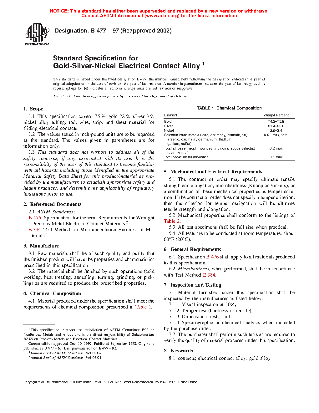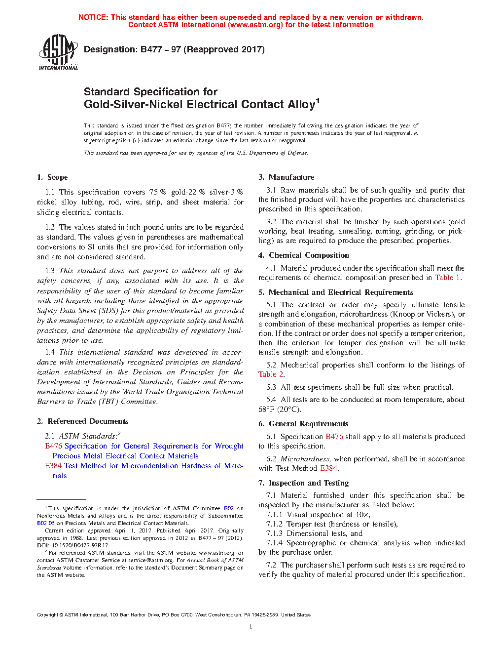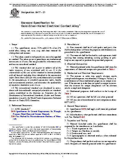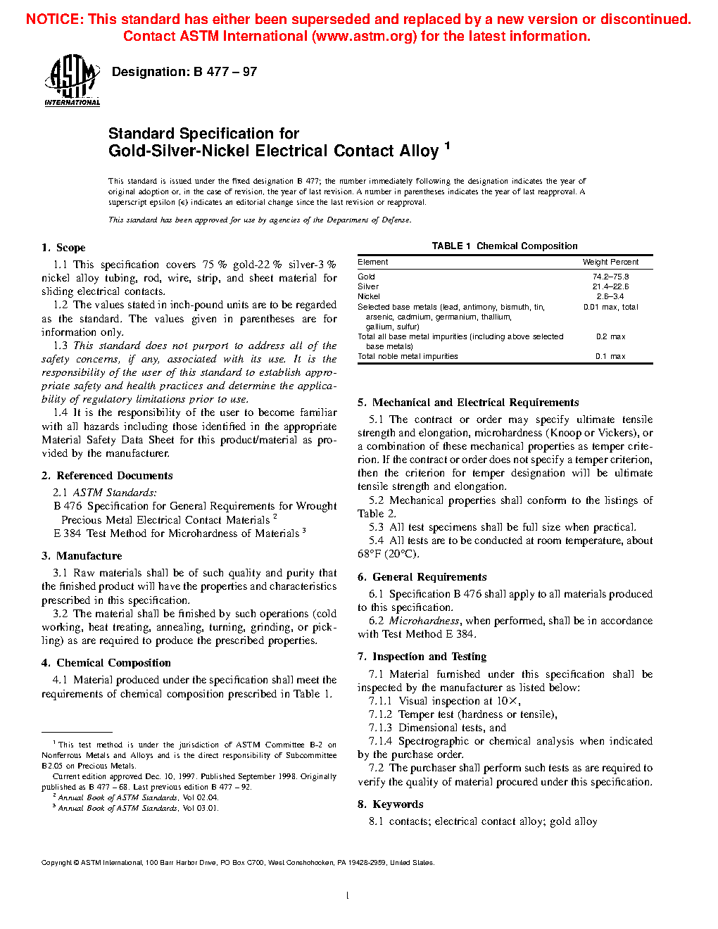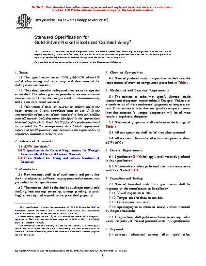 1.1 This specification covers 75% gold-22% silver-3% nickel alloy tubing, rod, wire, strip, and sheet material for sliding electrical contacts.