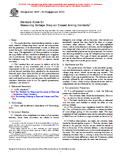 1.1 This guide describes recommended procedures to accurately measure voltage drop across current carrying contacts and the parameters to be documented in order to effectively record the results. Such contacts normally carry current greater than 1 amp. The applicability of these procedures to contacts carrying smaller currents should be evaluated prior to application to such devices. Contacts carrying small current may also be evaluated using Test Method B539 to measure contact resistance.