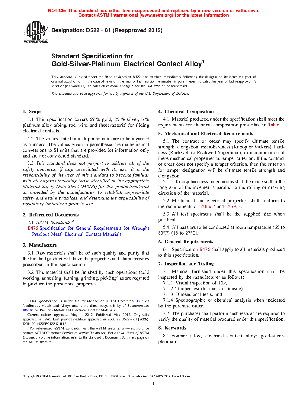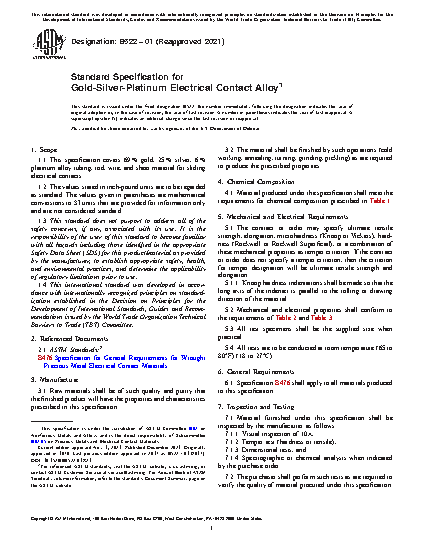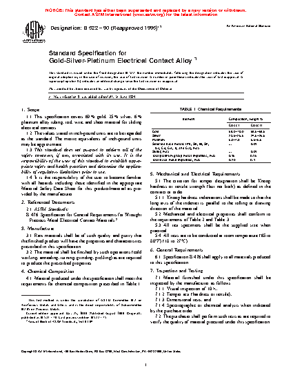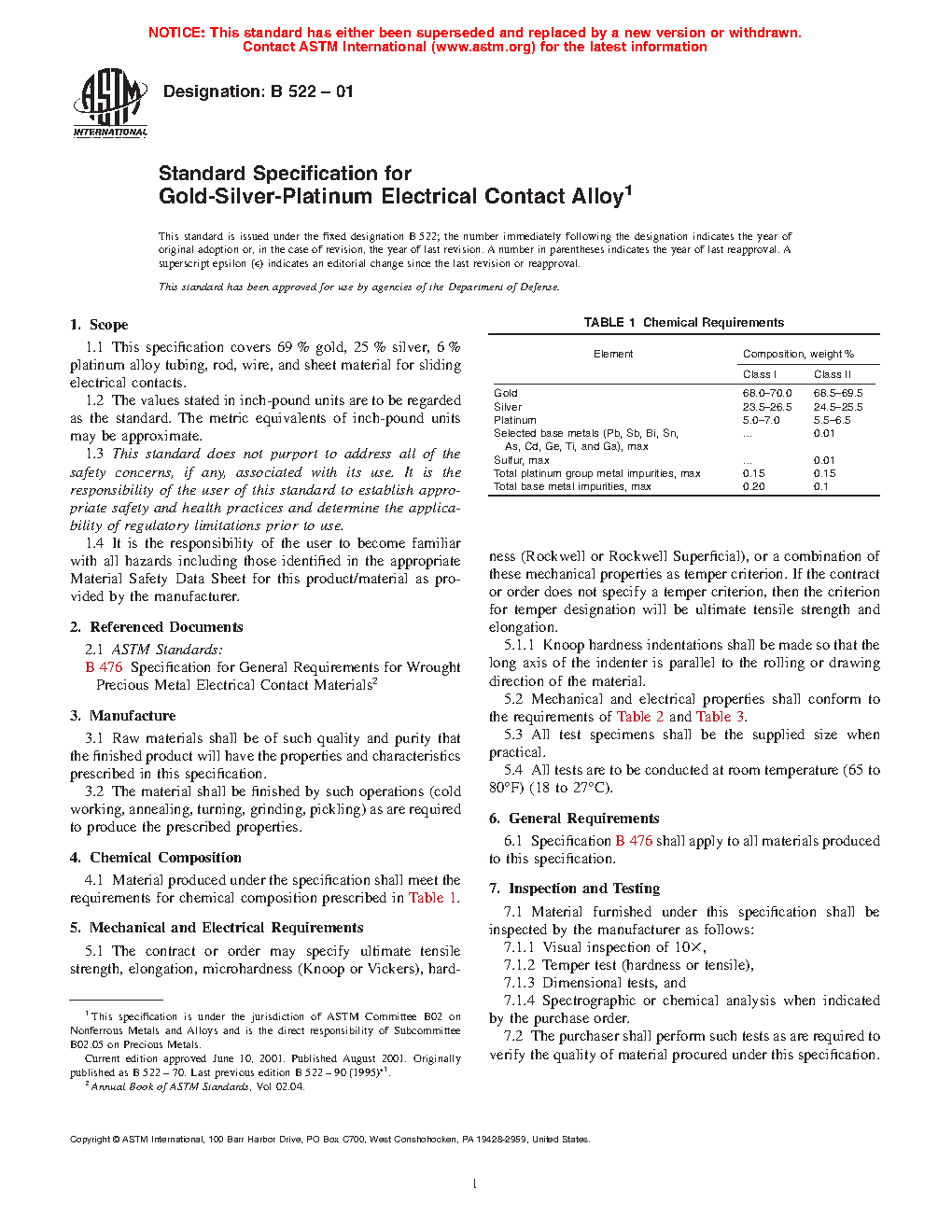 1.1 This specification covers 69% gold, 25% silver, 6% platinum alloy tubing, rod, wire, and sheet material for sliding electrical contacts.
