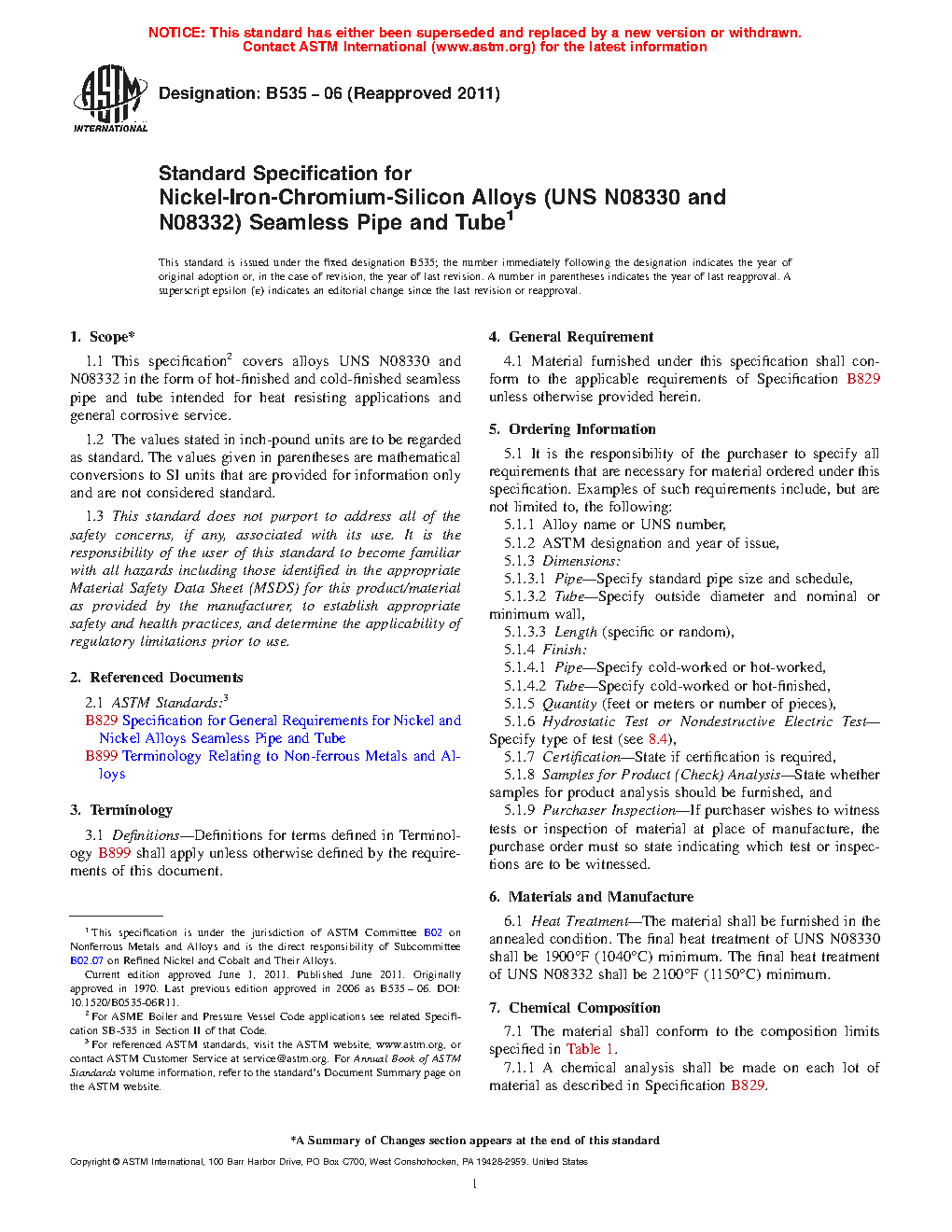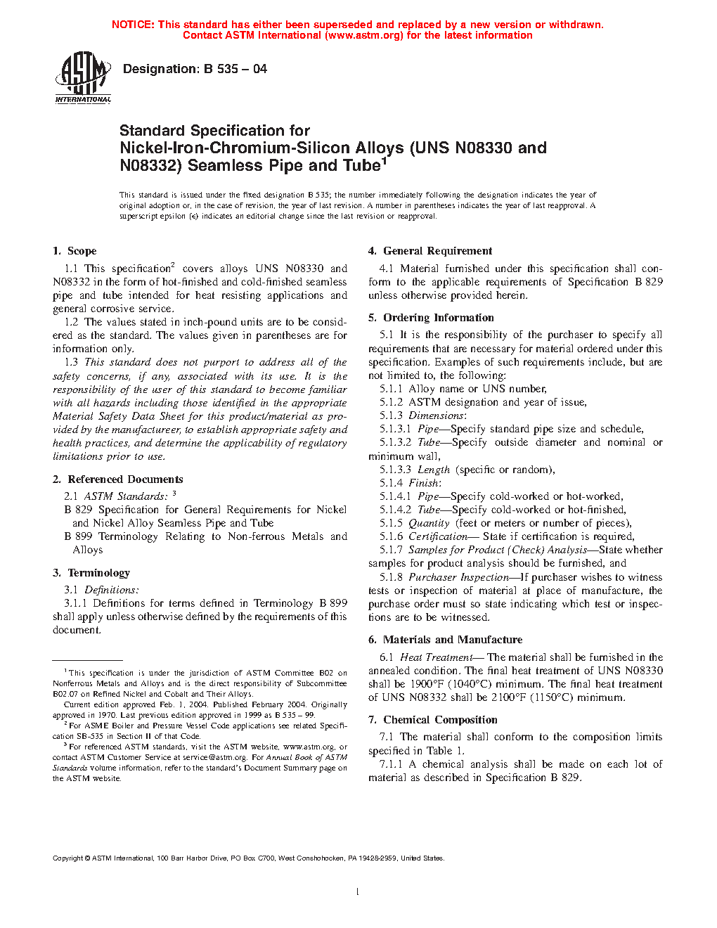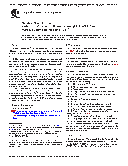Standard Specification for Nickel-Iron-Chromium-Silicon Alloys (UNS N08330 and N08332) Seamless Pipe and Tube