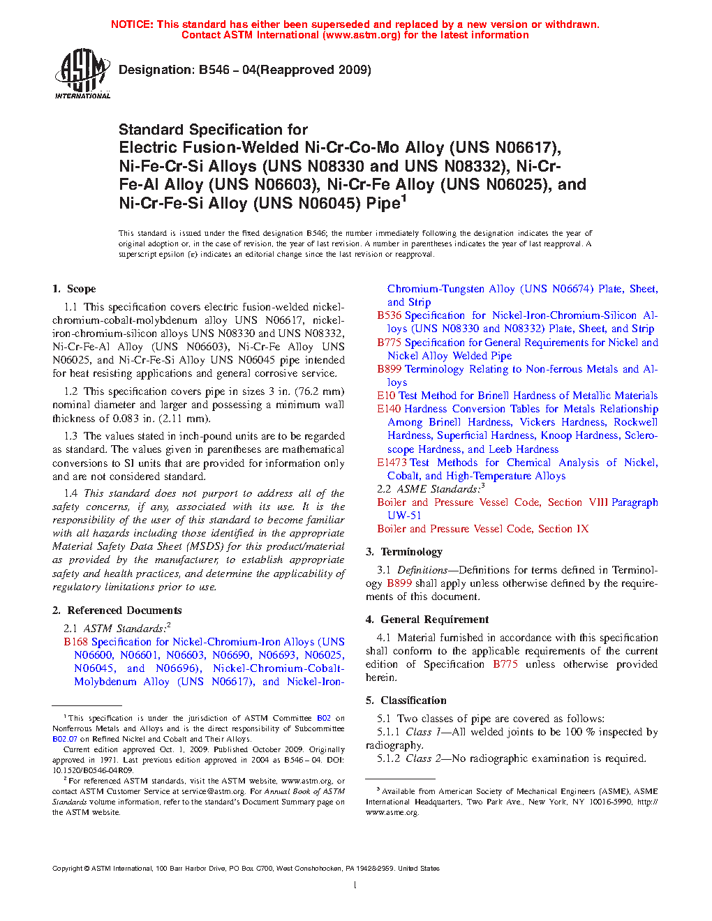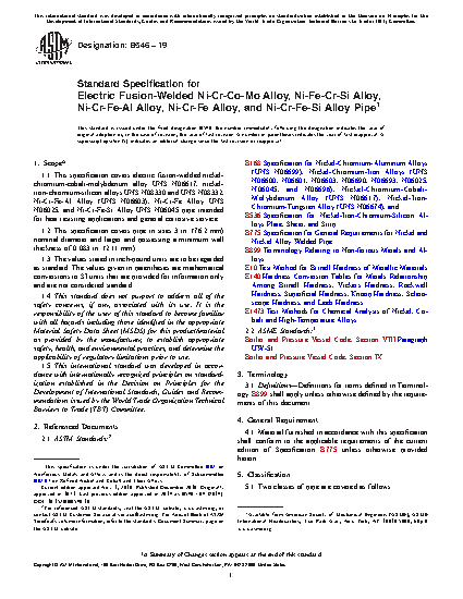 This specification covers electric fusion-welded nickel-chromium-cobalt-molybdenum alloy UNS N06617, nickel-iron-chromium-silicon alloys UNS N08330 and UNS N08332, Ni-Cr-Fe-Al Alloy (UNS N06603), Ni-Cr-Fe Alloy UNS N06025, and Ni-Cr-Fe-Si Alloy UNS N06045 pipe intended for heat resisting applications and general corrosive service. Two classes of pipes are covered: Class 1 and Class 2. The joints shall be double-welded, full-penetration welds. The weld shall be made either manually or automatically by an electric process involving the deposition of filler metal. Weld defects shall be repaired by removal to sound metal and rewelding. All pipe shall be furnished in the annealed condition. The material shall conform to the composition limits specified. Transverse tension test, transverse guided-bend weld test, pressure test, and chemical analysis shall be made to conform to the requirements specified.