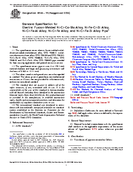 1.1 This specification covers electric fusion-welded nickel-chromium-cobalt-molybdenum alloy UNS N06617, nickel-iron-chromium-silicon alloys UNS N08330 and UNS N08332, Ni-Cr-Fe-Al Alloy (UNS N06603), Ni-Cr-Fe Alloy UNS N06025, and Ni-Cr-Fe-Si Alloy UNS N06045 pipe intended for heat resisting applications and general corrosive service.