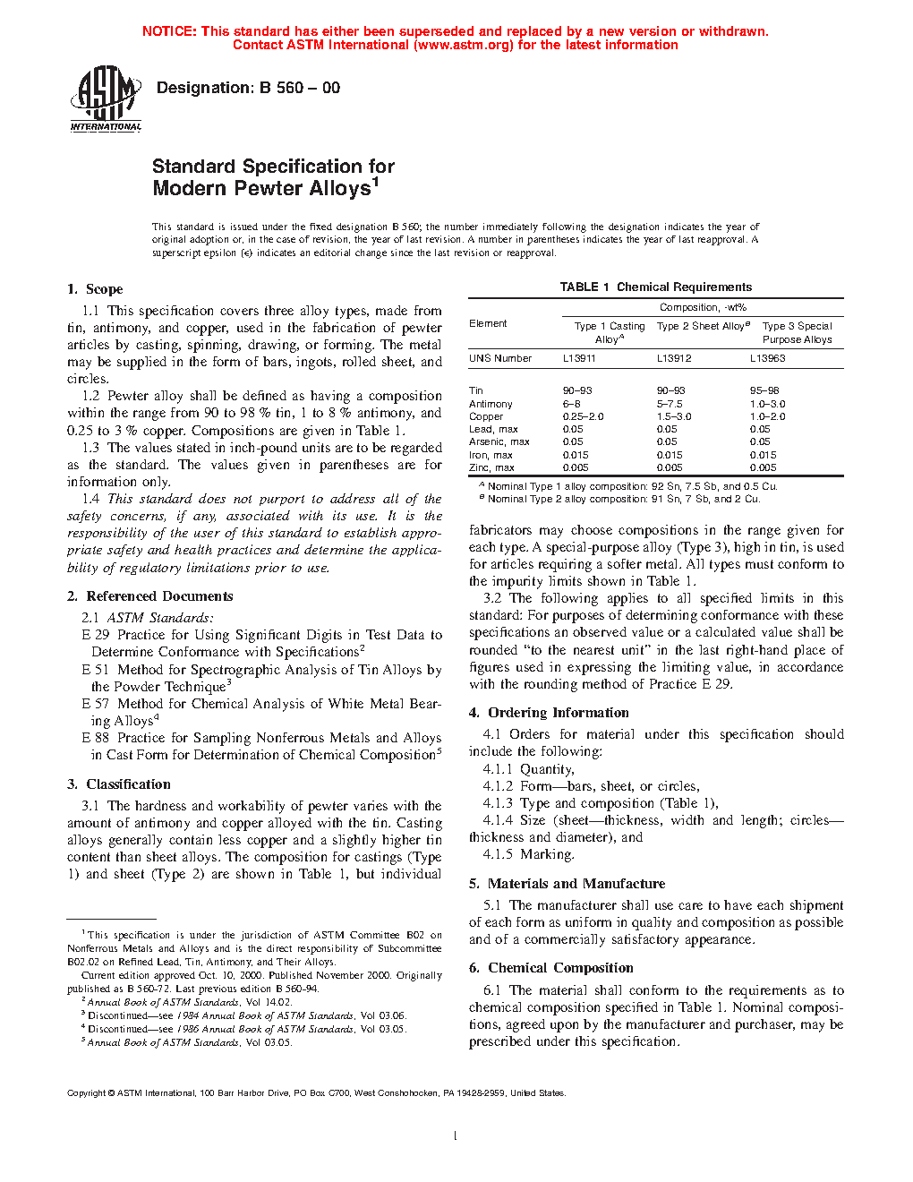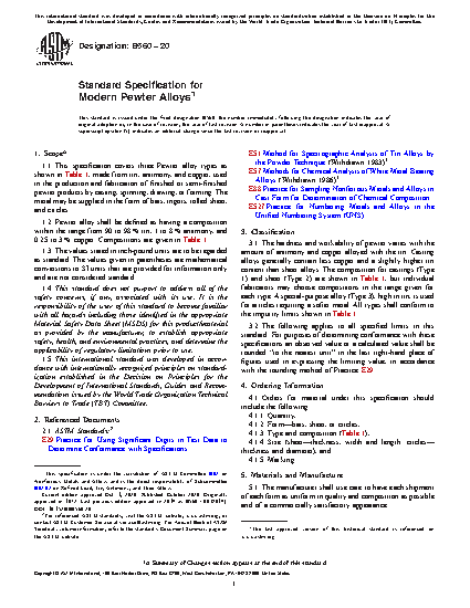 1.1 This specification covers three alloy types, made from tin, antimony, and copper, used in the fabrication of pewter articles by casting, spinning, drawing, or forming. The metal may be supplied in the form of bars, ingots, rolled sheet, and circles.