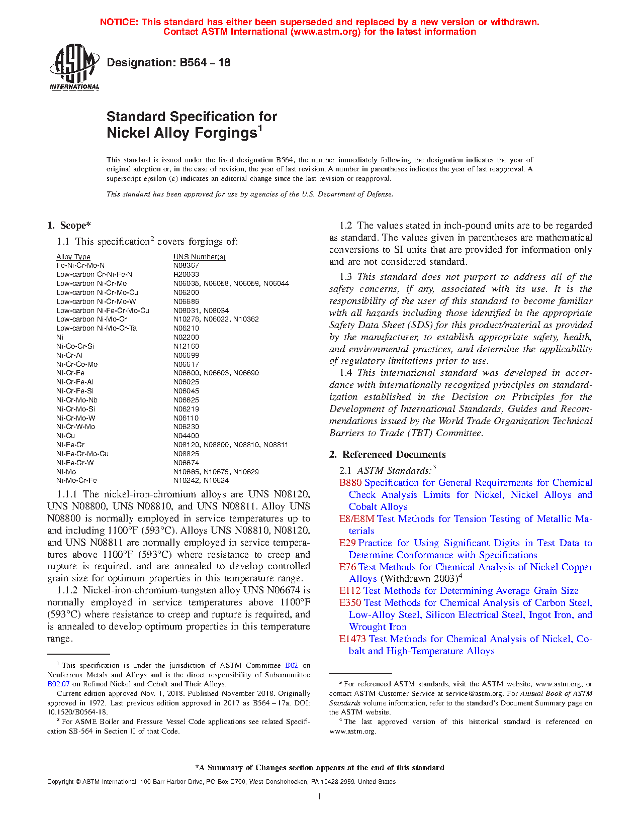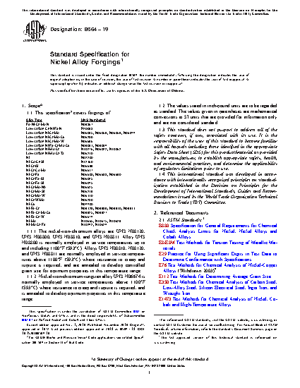 This specification covers nickel alloy forgings. These alloys are classified into different grades according to their chemical composition. A chemical analysis shall be employed on each alloy in order to determine its chemical composition. Grain size and mechanical properties like tensile strength, yield strength, and elongation shall be measured. A tension test and nondestructive ultrasonic test shall be done on each specimen.