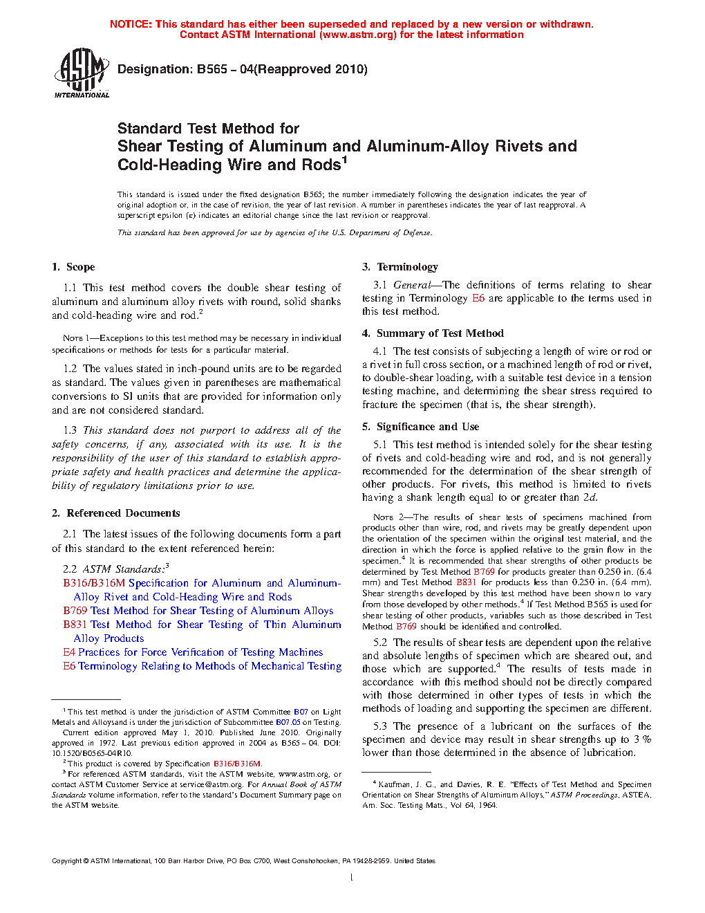 Standard Test Method for Shear Testing of Aluminum and Aluminum-Alloy Rivets and Cold-Heading Wire and Rods