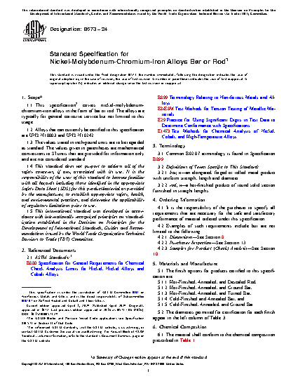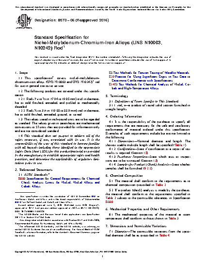 1.1 This specification covers nickel-molybdenum-chromium-iron alloys (UNS N10003 and UNS N10242)* rod for use in general corrosive service.