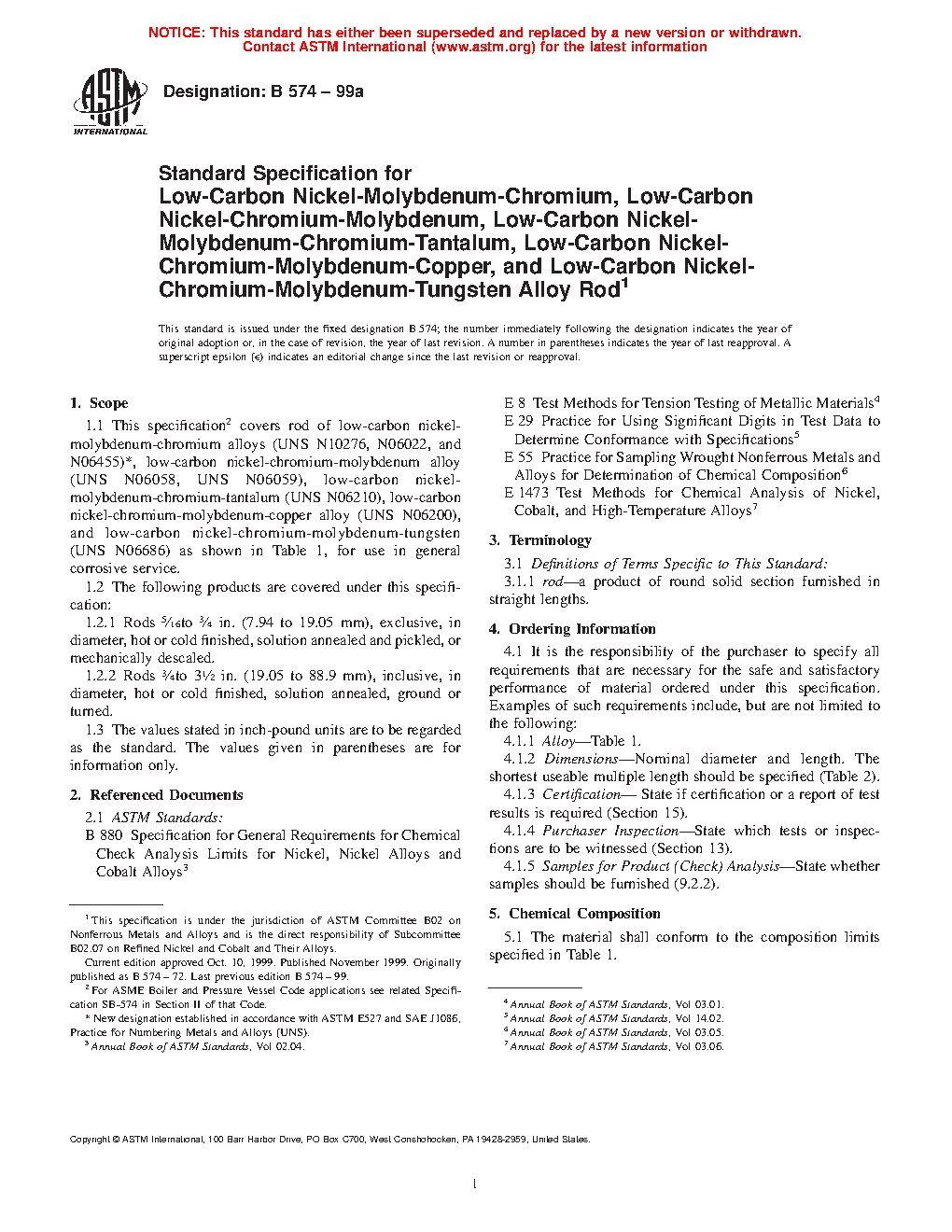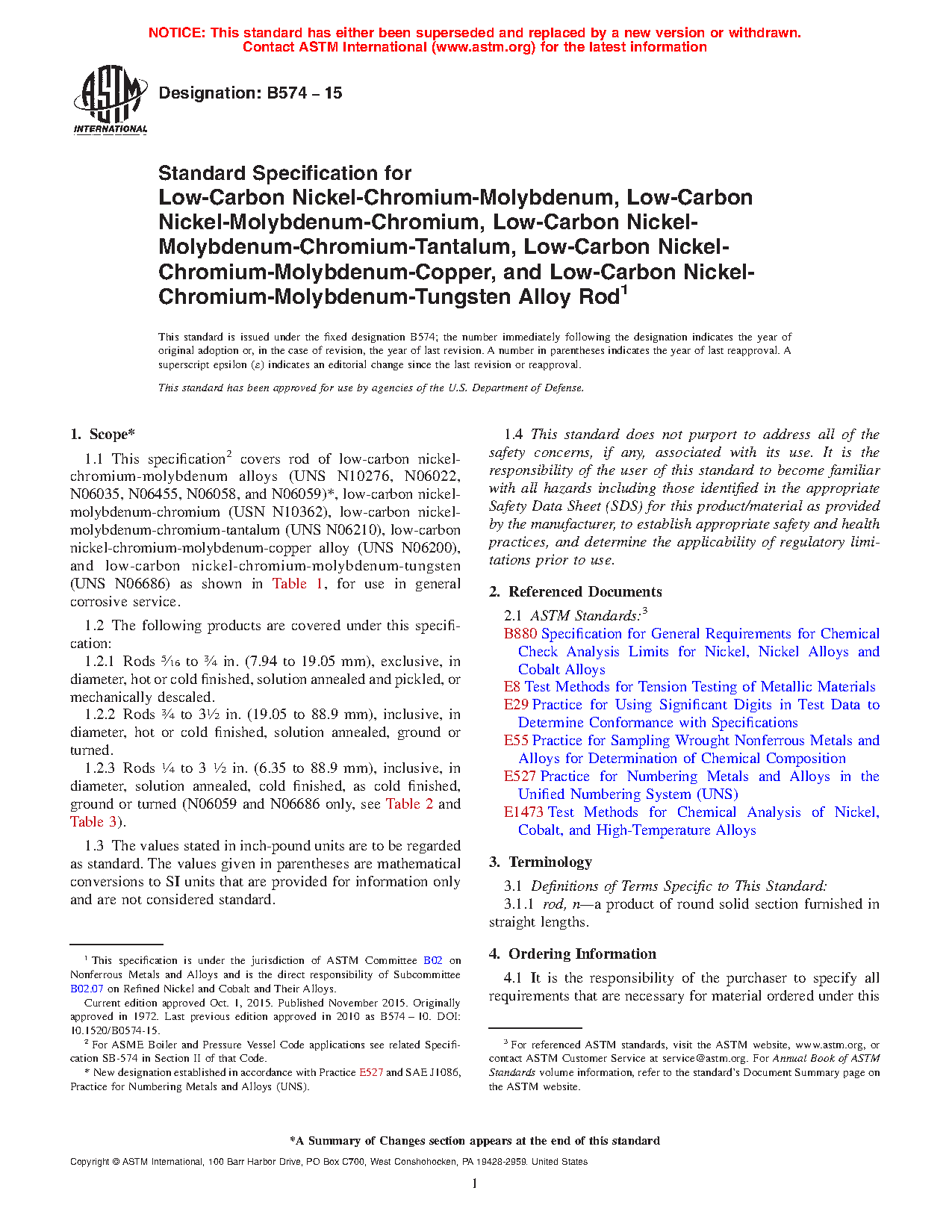 This specification2 covers rod of low-carbon nickel-chromium- molybdenum alloys (UNS N10276, N06022, N06035, N06455, N06058, and N06059), low-carbon nickel-molybdenum- chromium-tantalum (UNS N06210), low-carbon nickel-chromium-molybdenum-copper alloy (UNS N06200), and low-carbon nickel-chromium-molybdenum-tungsten (UNS N06686), for use in general corrosive service. Product and chemical analyses shall be performed on the materials and shall conform to the required chemical composition in molybdenum, chromium, iron, tungsten, cobalt, carbon, silicon, manganese, vanadium, phosphorus, sulfur, titanium, nickel, aluminum, copper, and tantalum. Tension test shall be performed and shall comply to required mechanical properties for hot or cold finished, solution annealed rods such as tensile strength, yield strength, and elongation.
