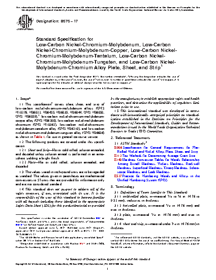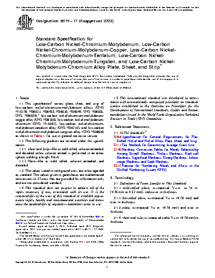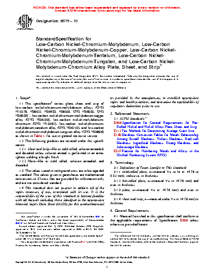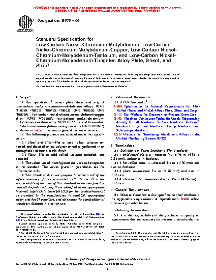 This specification covers plate, sheet, and strip of low-carbon nickel-chromium-molybdenum alloys (UNS N10276, N06022, N06455, N06035, UNS N06058, UNS N06059), low carbon nickel-chromium-molybdenum-copper alloy (UNS N06200), low-carbon nickel-chromium-molybdenum-tantalum alloy (UNS N06210), and low-carbon nickel-chromium-molybdenum-tungsten alloy (UNS N06686) for use in general corrosive service. The materials shall conform to the required chemical composition for molybdenum, chromium, iorn, tungsten, cobalt, arbon, silicon, manganese, vanadium, phosphorus, sulfur, titanium, nickel, aluminum, copper, and tantalum. The alloys shall connform to the required tensile properties such as tensile strength, yield strength, elongation, and Rockwell hardness. Sheet and strip shall conform to the required grain sizes. Dimensions such as plate, sheet and strip thickness, width, length, straightness, squareness, flatness and edges shall be determined.