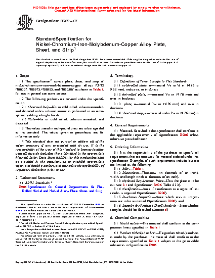 1.1 The specification covers plate, sheet, and strip of nickel-chromium-iron-molybdenum-copper alloys (UNS N06007, N06975, N06985, and N06030)* as shown in , for use in general corrosive service.