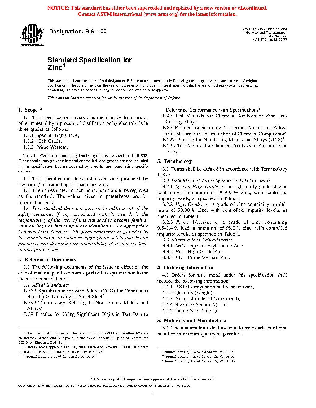 1.1 This specification covers zinc metal made from ore or other material by a process of distillation or by electrolysis in five grades as follows: