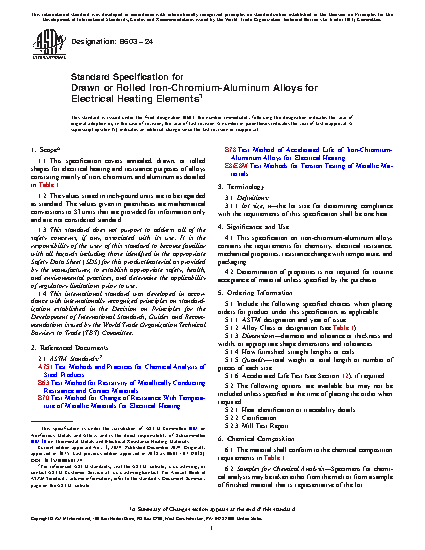 This specification covers annealed, drawn or rolled iron-chromium-aluminum alloy shapes used for electrical heating and resistance purposes. This specification contains the requirements for chemical composition, electrical resistance, mechanical properties and temperature-dependent changes in resistance of the alloys.