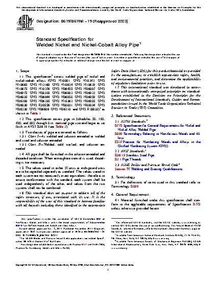 1.1 This specification2 covers welded pipe of nickel and nickel-cobalt alloys (UNS N10001; UNS N10242; UNS N10665; UNS N12160; UNS N10624; UNS N10629; UNS N10675; UNS N10276; UNS N06455; UNS N06007; UNS N06975; UNS N08320; UNS N06002; UNS N06022; UNS N06035; UNS N06044; UNS N06058; UNS N06059; UNS N06200; UNS N06235; UNS N10362; UNS N06985; UNS N06030; UNS R30556; UNS N08031; UNS N08034; UNS N06230; UNS N06686; UNS N06210; and UNS R20033)3 as shown in Table 1.