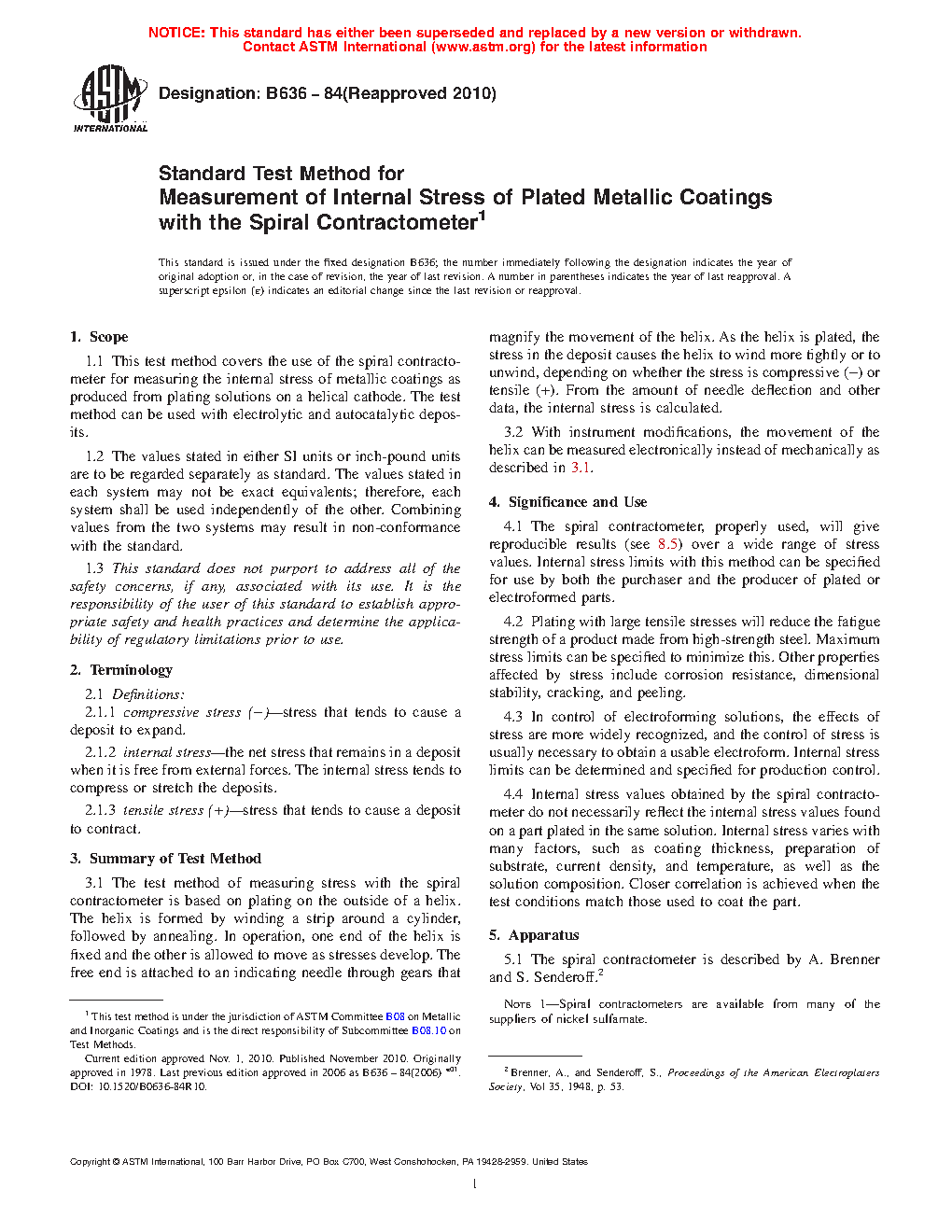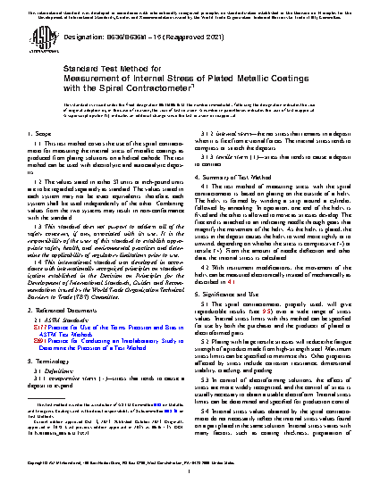 1.1 This test method covers the use of the spiral contractometer for measuring the internal stress of metallic coatings as produced from plating solutions on a helical cathode. The test method can be used with electrolytic and autocatalytic deposits.