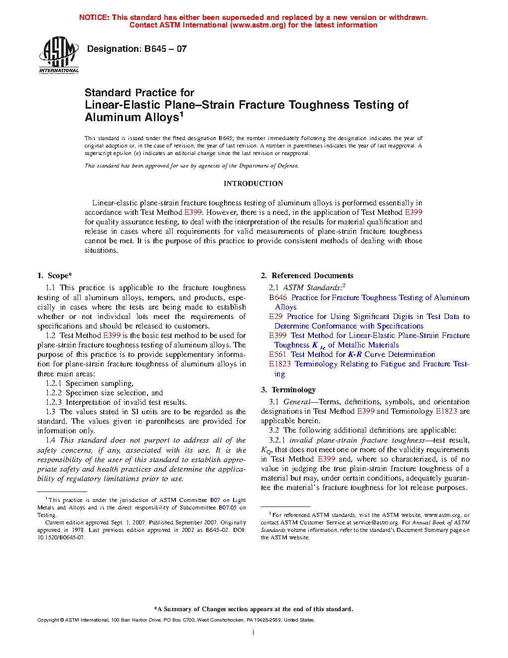 1.1 This practice is applicable to the fracture toughness testing of all aluminum alloys, tempers, and products, especially in cases where the tests are being made to establish whether or not individual lots meet the requirements of specifications and should be released to customers.
