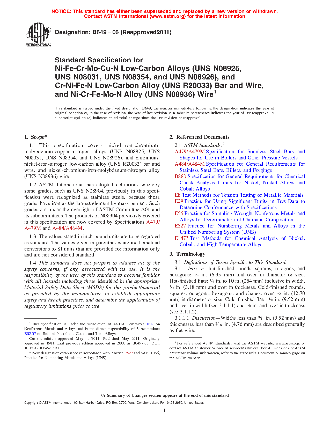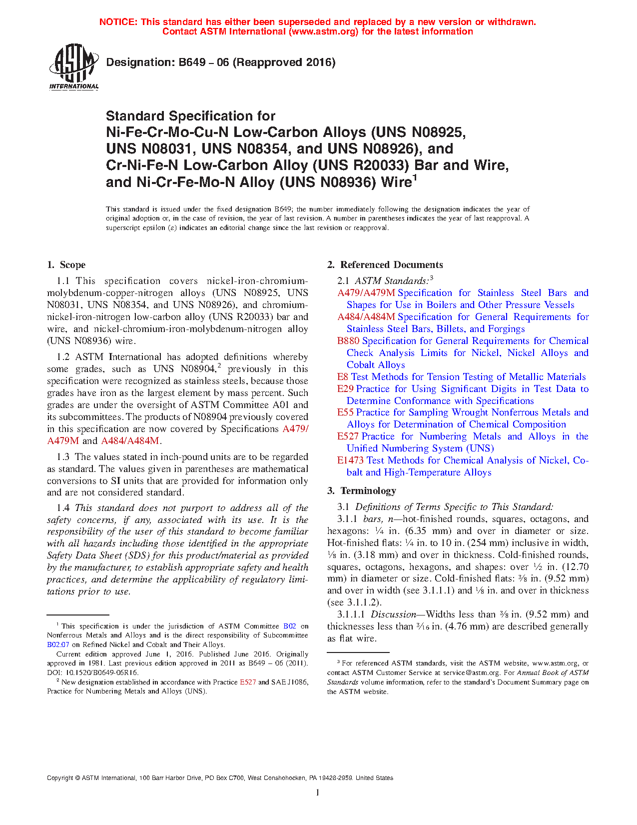 1.1 This specification covers nickel-iron-chromium-molybdenum-copper low-carbon alloys (UNS N08904)*, nickel-iron-chromium-molybdenum-copper-nitrogen alloys (UNS N08925, UNS N08031, and UNS N08926), and Cr-Ni-Fe-N low-carbon alloy (UNS R20033) bar and wire.