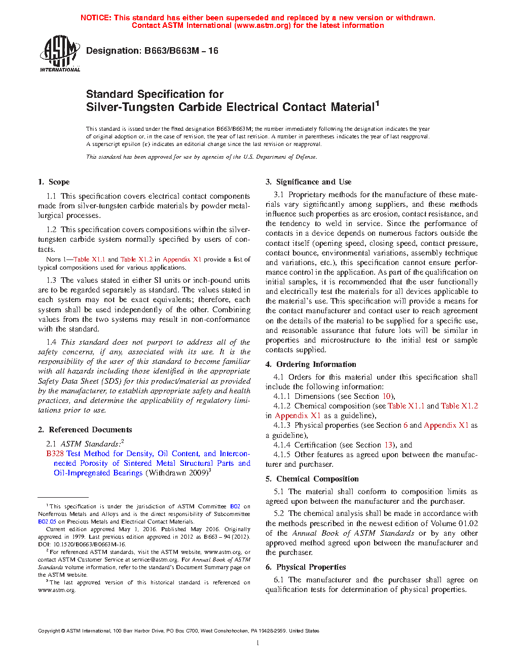 1.1 This specification covers electrical contact components made from silver-tungsten carbide materials by powder metallurgical processes.