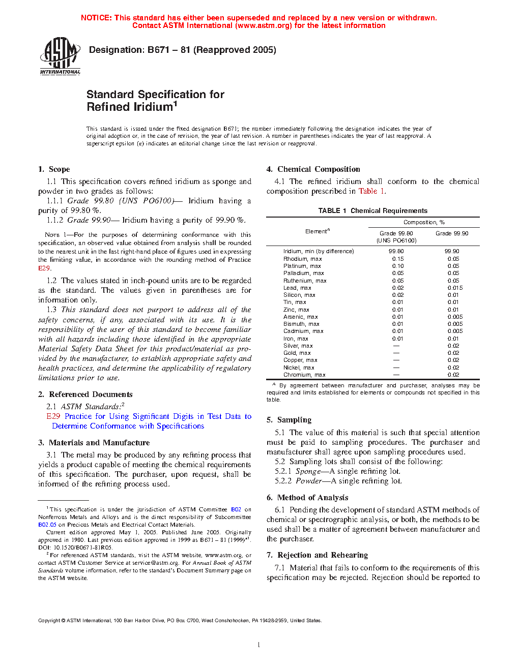 1.1.1 Grade 99.80 (UNS PO6100)—Iridium having a purity of 99.80 %.