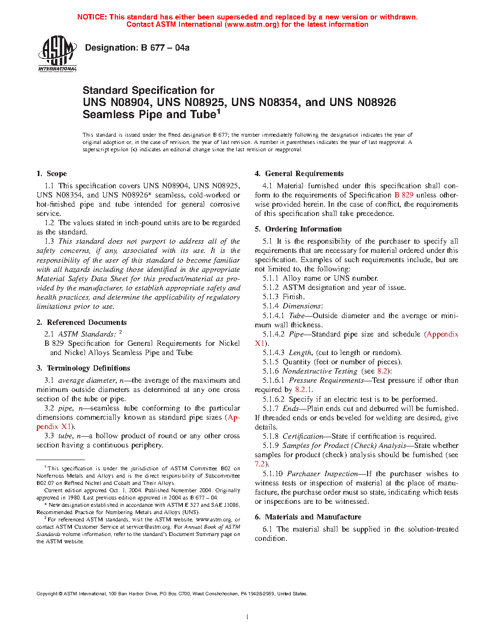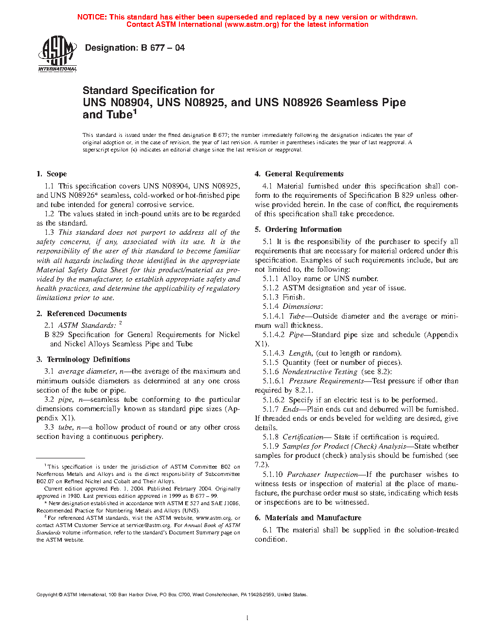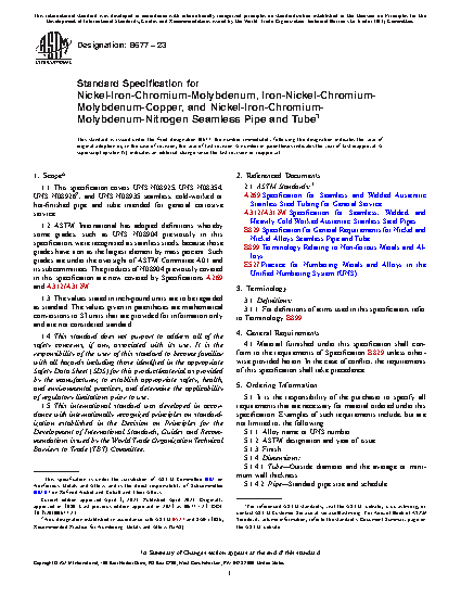 1.1 This specification covers UNS N08904, UNS N08925, and UNS N08926* seamless, cold-worked or hot-finished pipe and tube intended for general corrosive service.