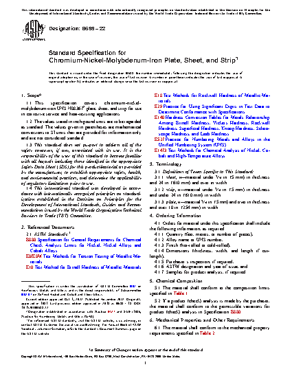1.1 This specification covers chromium-nickel-molybdenum-iron UNS N08366 and UNS N08367* plate, sheet, and strip for use in corrosive service and heat-resisting applications.